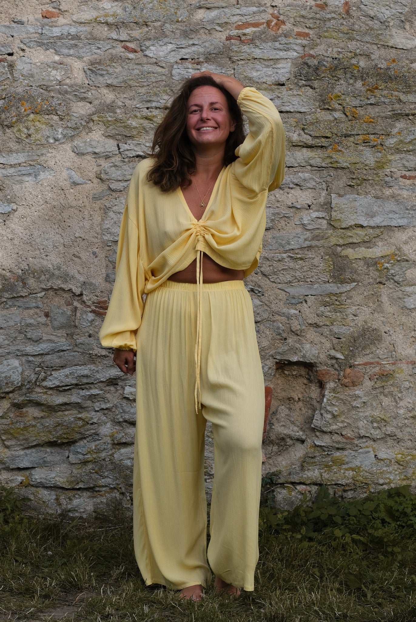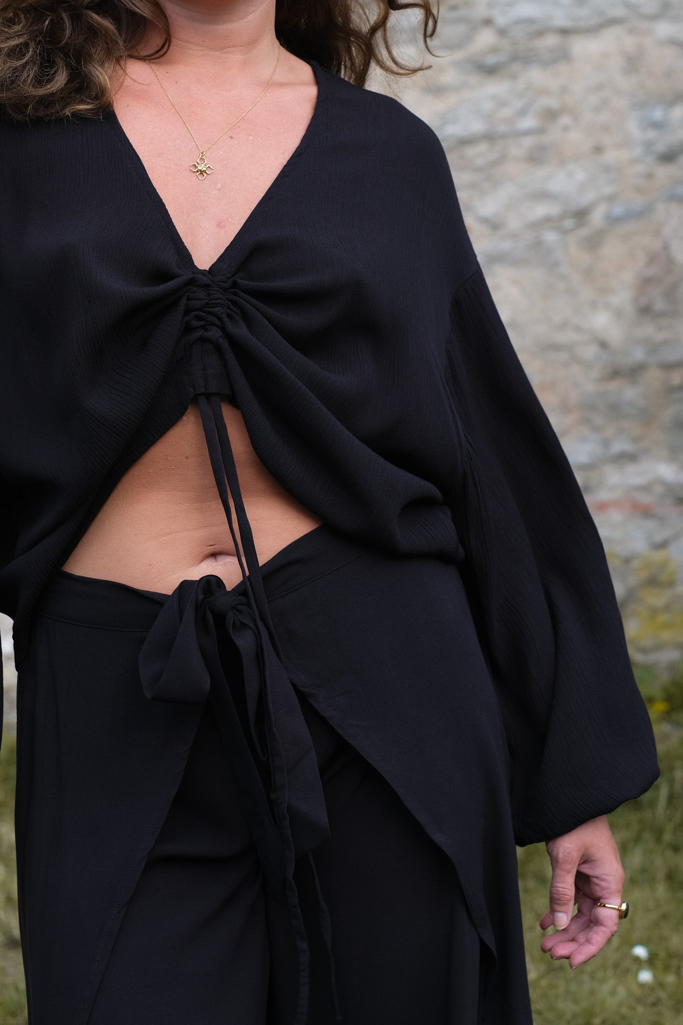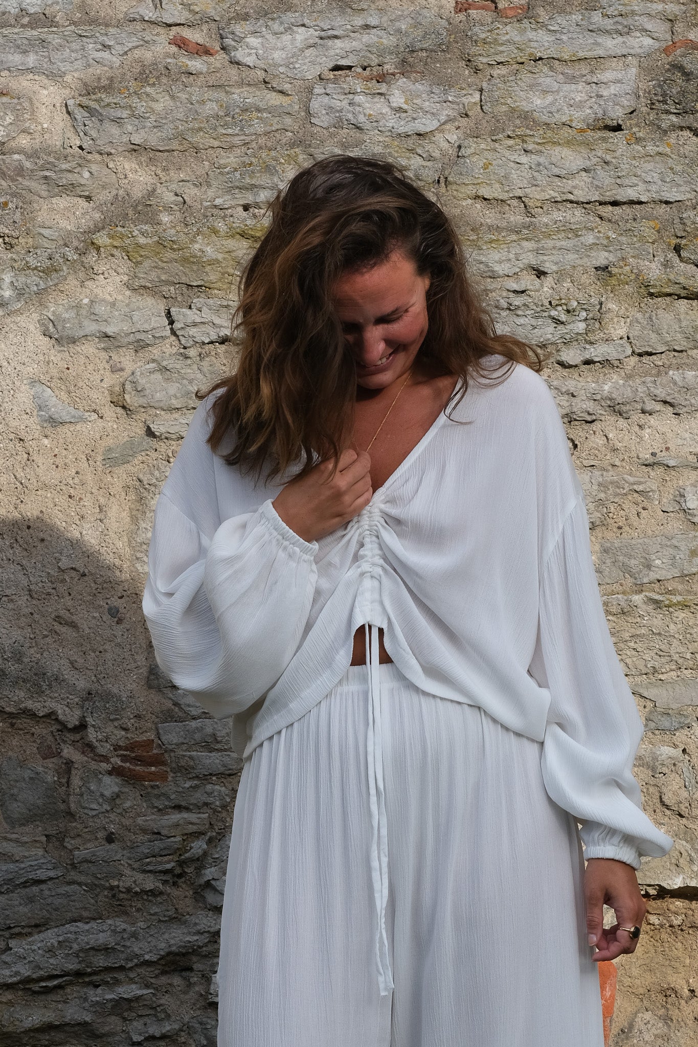 Drawstring top har en avslappnad passform, ballongärm med resåravslut och en feminin v-ringning. En topp lika fin att bära uppknuten till önskad längd eller helt nedsläppt. En riktig boho-favorit bland er!
