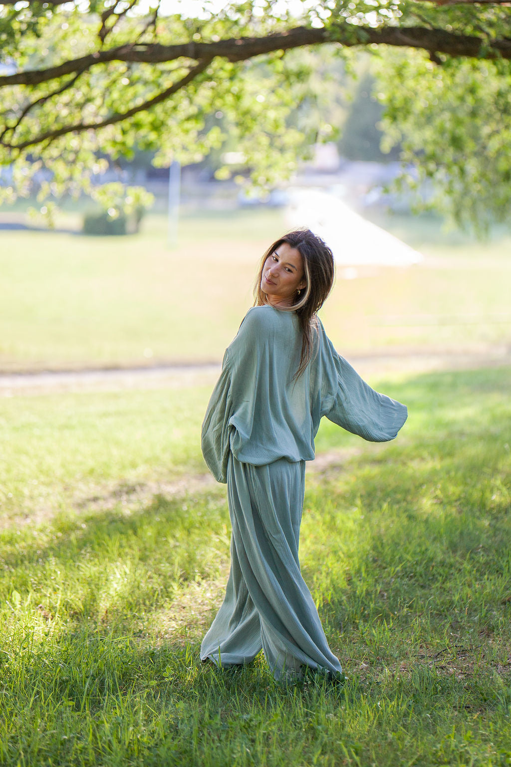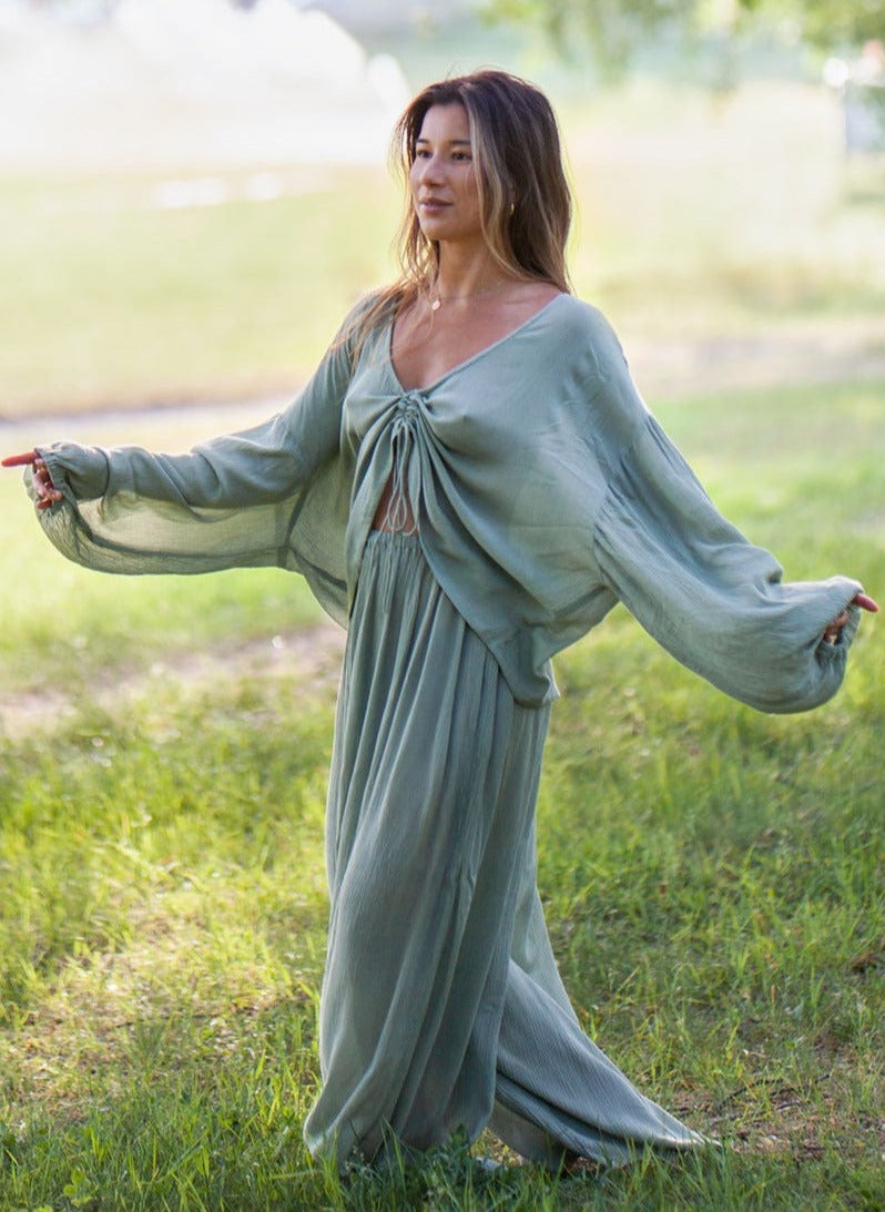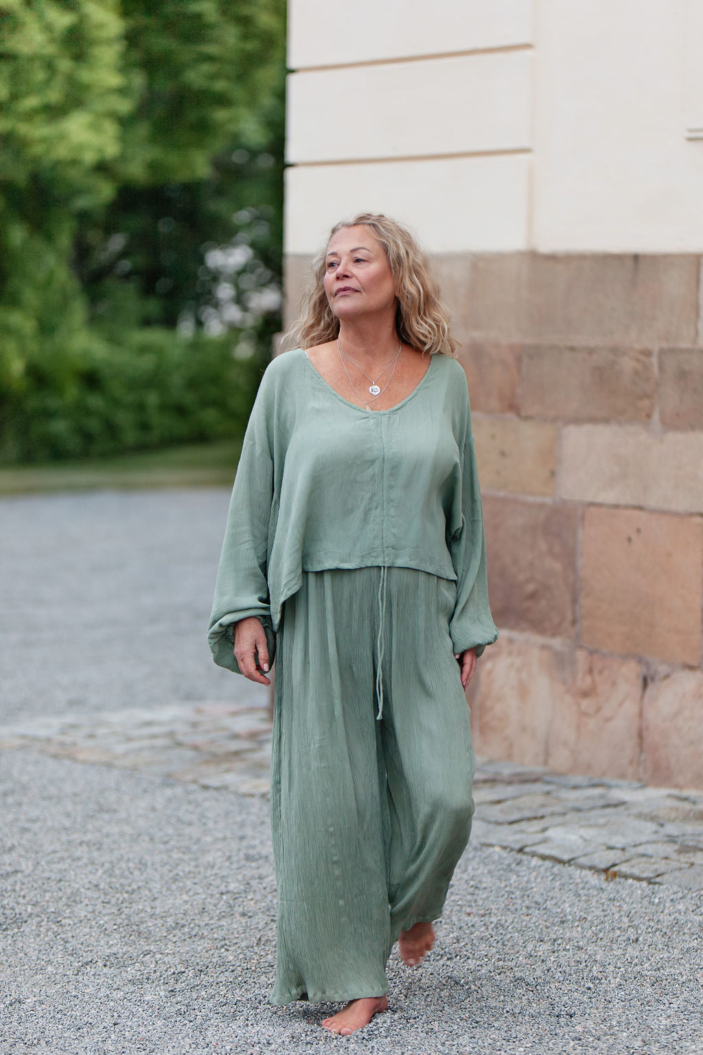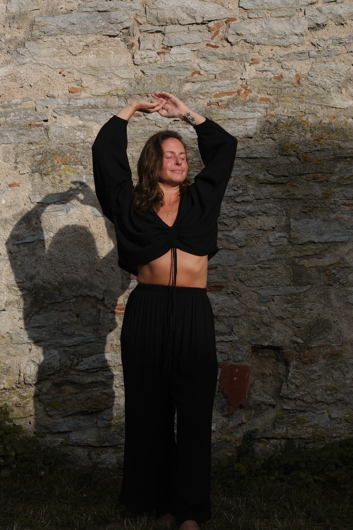 Drawstring top har en avslappnad passform, ballongärm med resåravslut och en feminin v-ringning. En topp lika fin att bära uppknuten till önskad längd eller helt nedsläppt. En riktig boho-favorit bland er!
