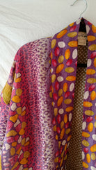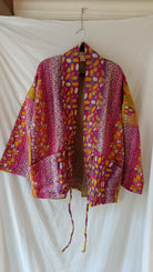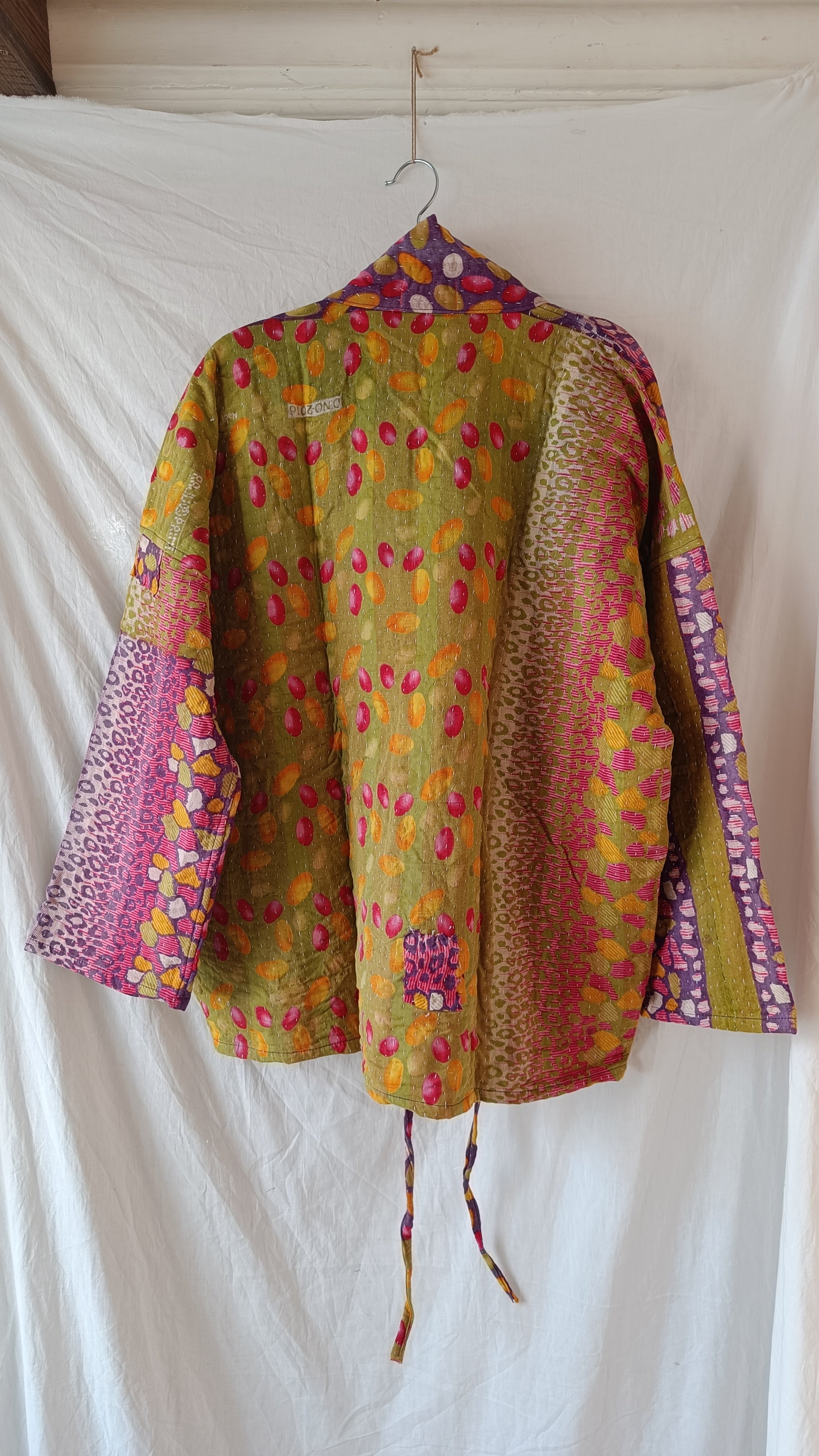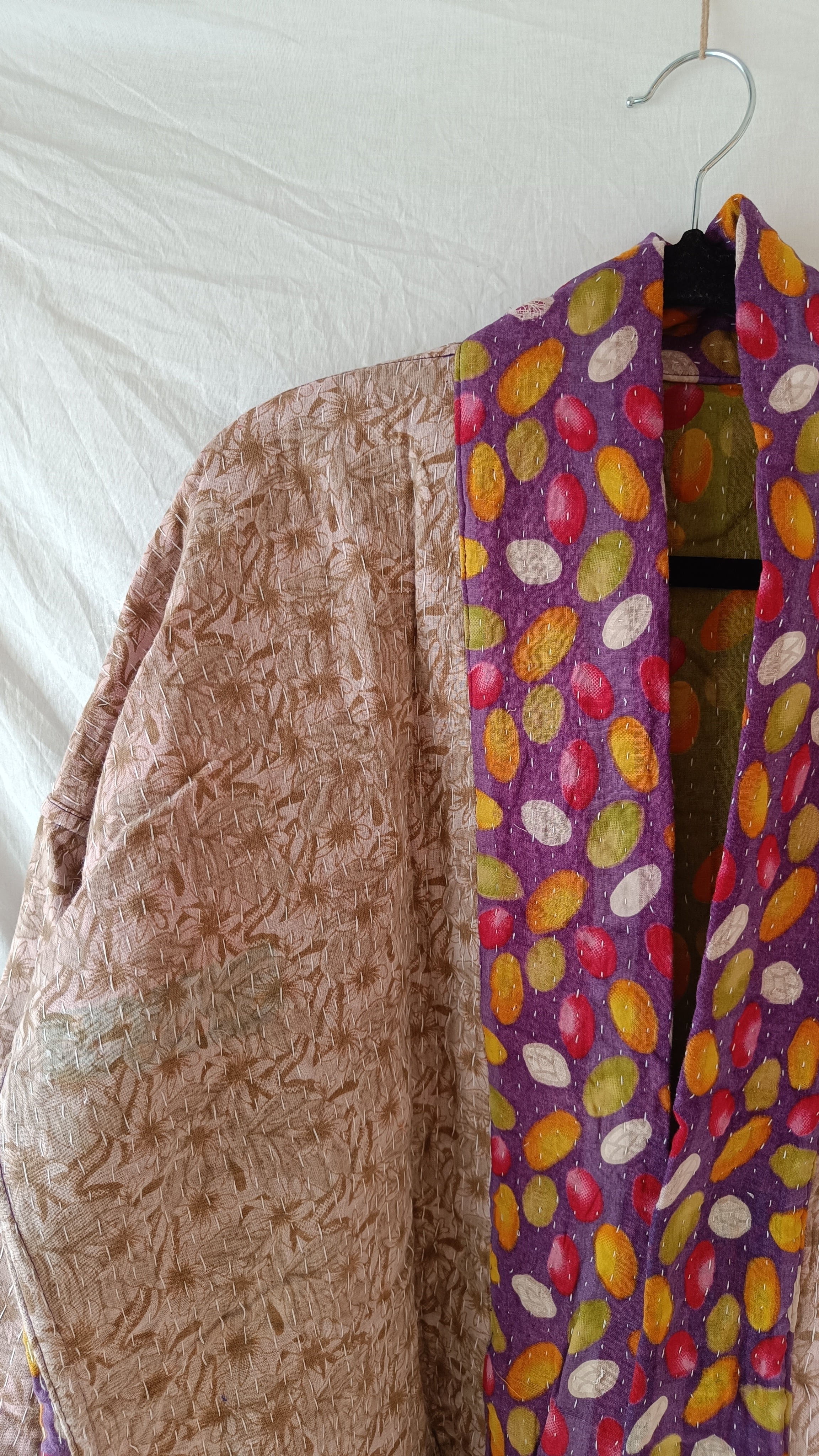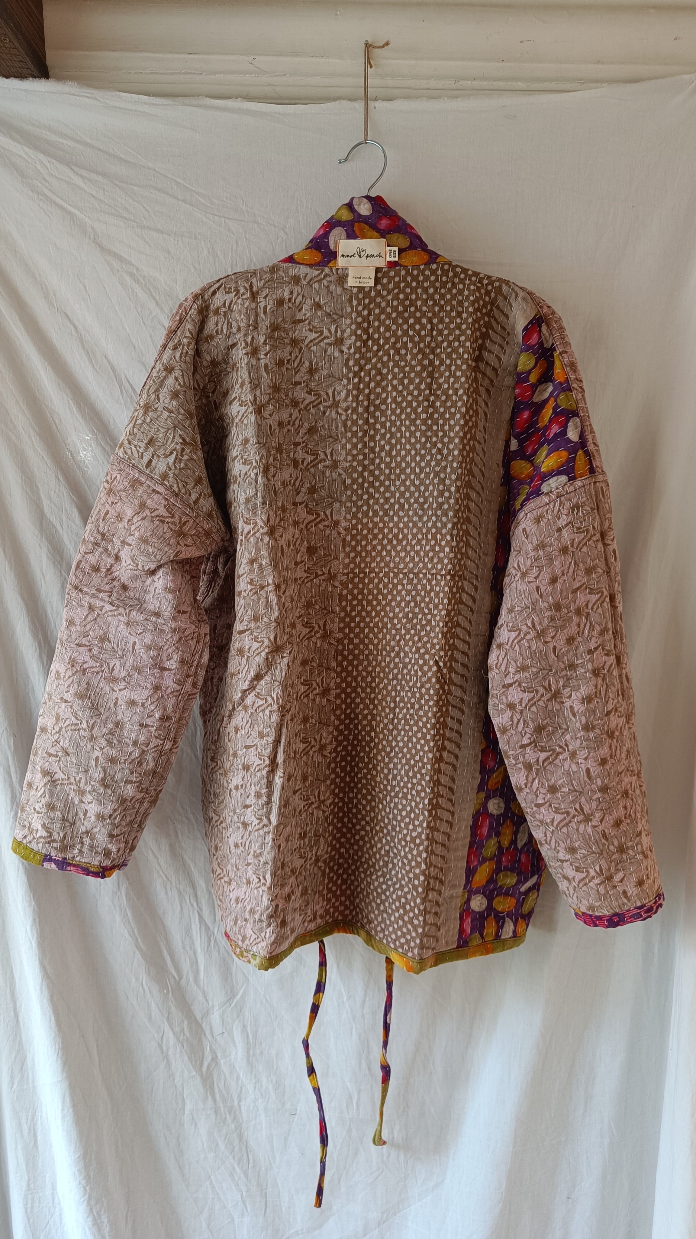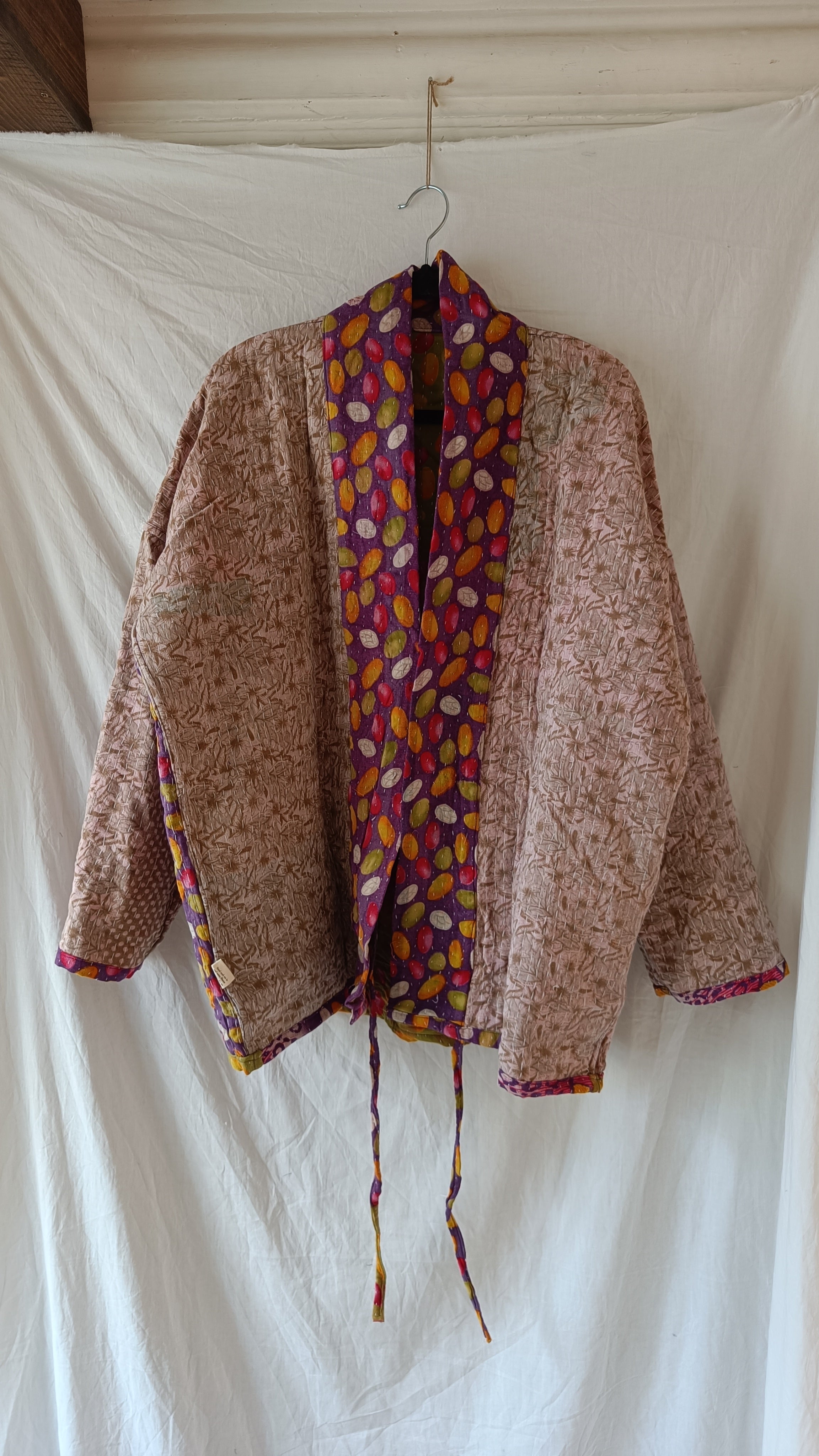 Helt unik kanthajacka i bomull. Gjord av handplockade kanthafiltar från norra Indien. Tyget räcker enbart till en jacka i just det här utförandet, vilket innebär att varenda en är helt one-of a kind. Jackan är vändbar (något jag älskade med 90-talets kläder och försöker få tillbaka!), har två stora fickor på ena framsidan samt snören som går att knyta framtill så jackan stängs.