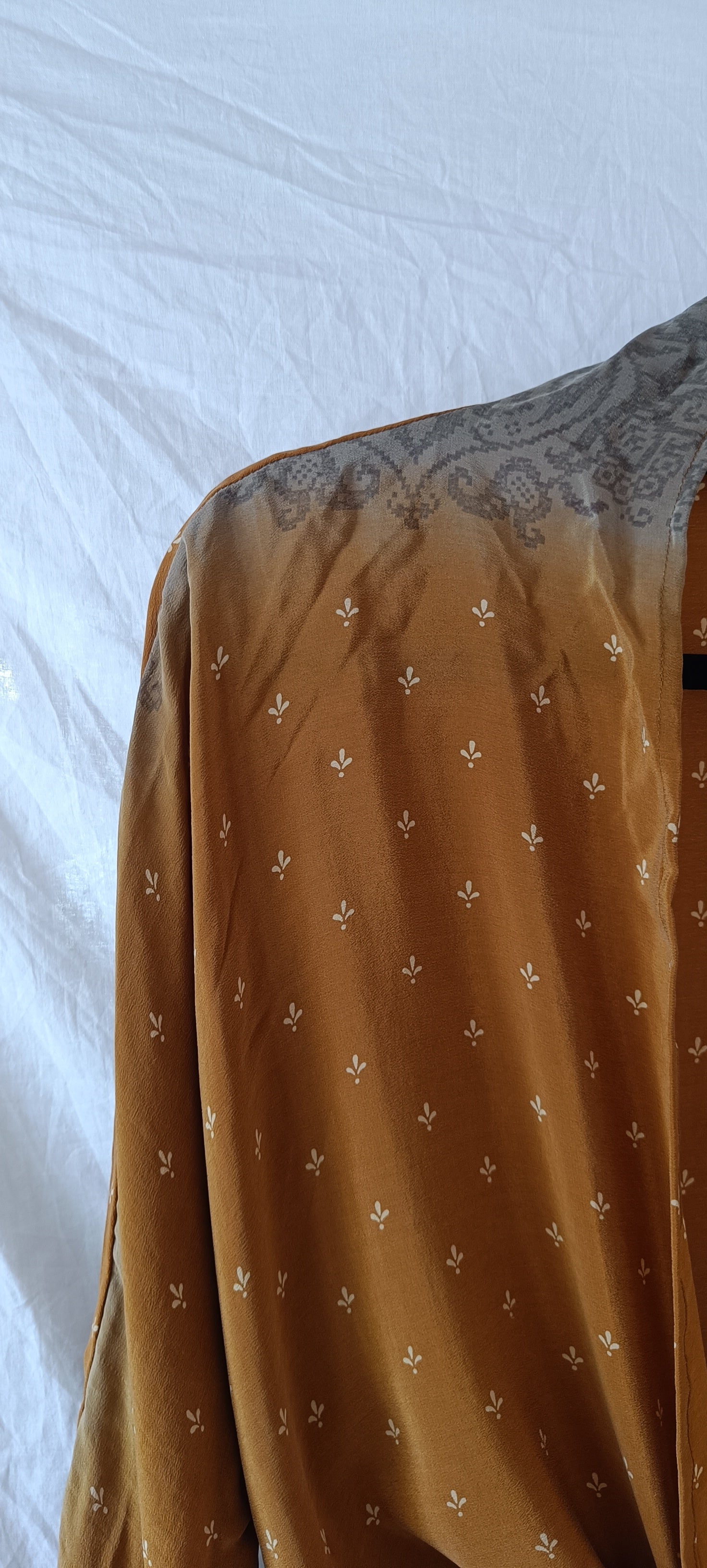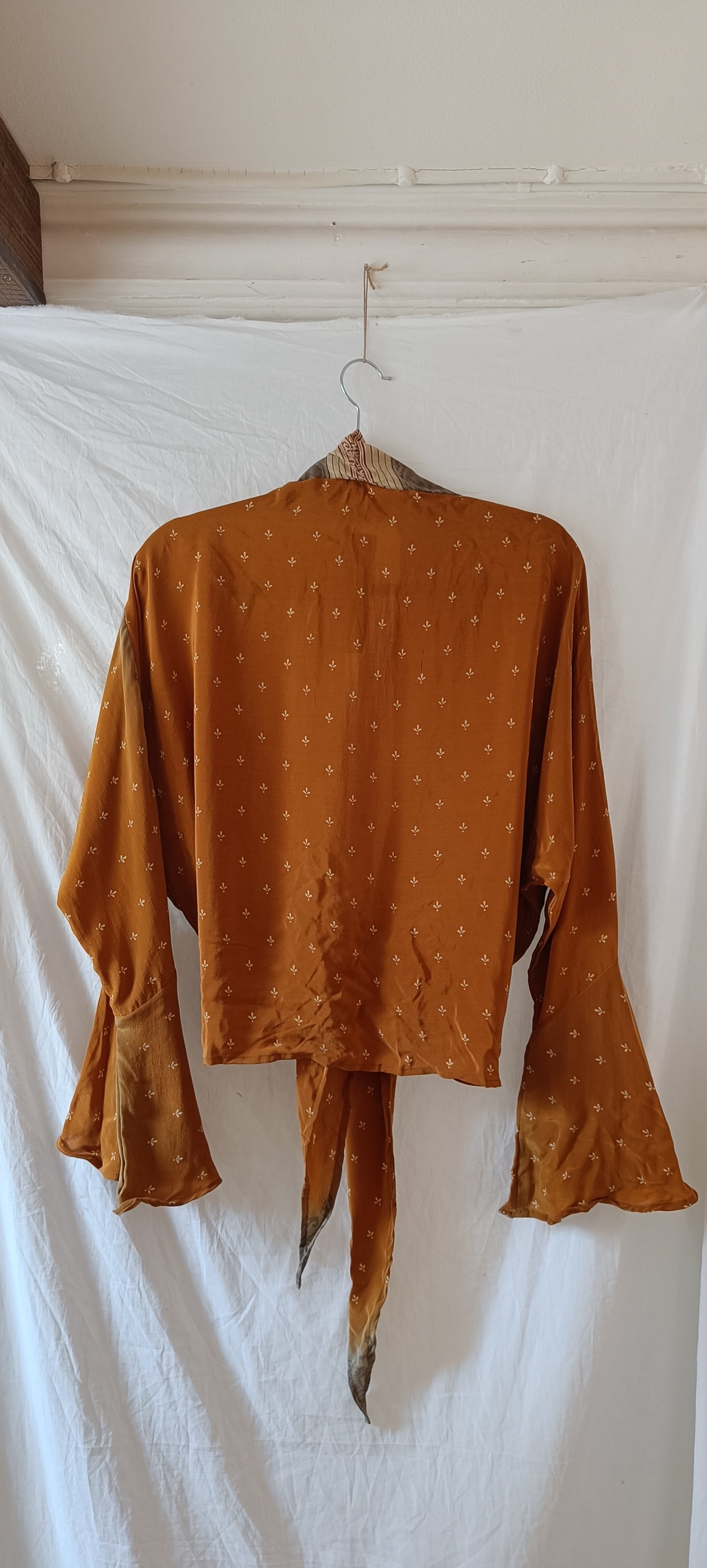 Då tyget är återbrukat silke kan det finnas mindre märken som är små tecken på den historia tyget bär på. På sista bilderna ser du hur modellen sitter på, första modellen bär normalt sett storlek S och andra modellen normalt sett storlek XL.