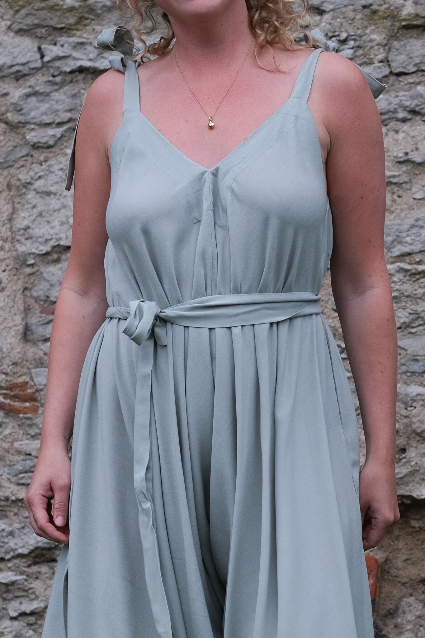 Mad Peach jumpsuit är min signaturmodell och bästsäljare sen start. Byxdräktens flowiga ben får många att tro att det är en klänning när du bär den (men blir överraskade när du går och man ser att det är en jumpsuit). Byxdräkten har en avslappnad passform, v-ringning både fram och bak, vida ben och axelband du själv knyter till önskad längd. Bär den med eller utan det medföljande midjebandet - med ger en feminin och elegant känsla och utan gör den cool och skön.