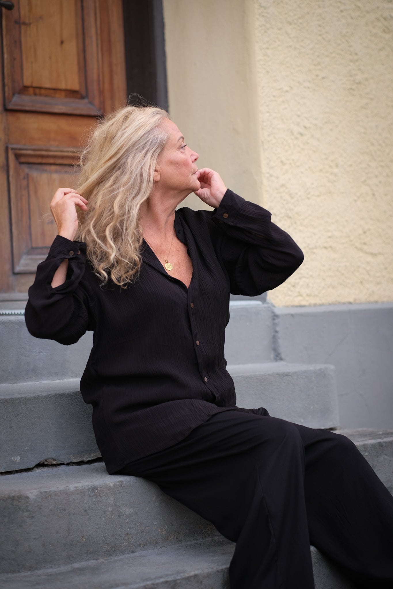 Unisex shirt är Mad Peach signaturskjorta och bästsäljare. Tillverkad i mjukaste viskos med kokosknappar som detalj. Passformen är avslappnad och kragen en så kallad kinakrage. Lika snygg att bära knäppt som uppknäppt, knuten framtill, upp - eller nerrullade ärmar och över sommarklänningen. Skjortan är unisex.