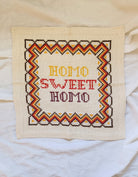 Handgjort broderi från Gotland, gjort på återbrukat tyg och med återbrukad tråd. Passar lika fint inramad som att sättas upp som det är. Våga dissa klassikern "hem ljuva hem" och satsa på ett broderi som sticker ut!