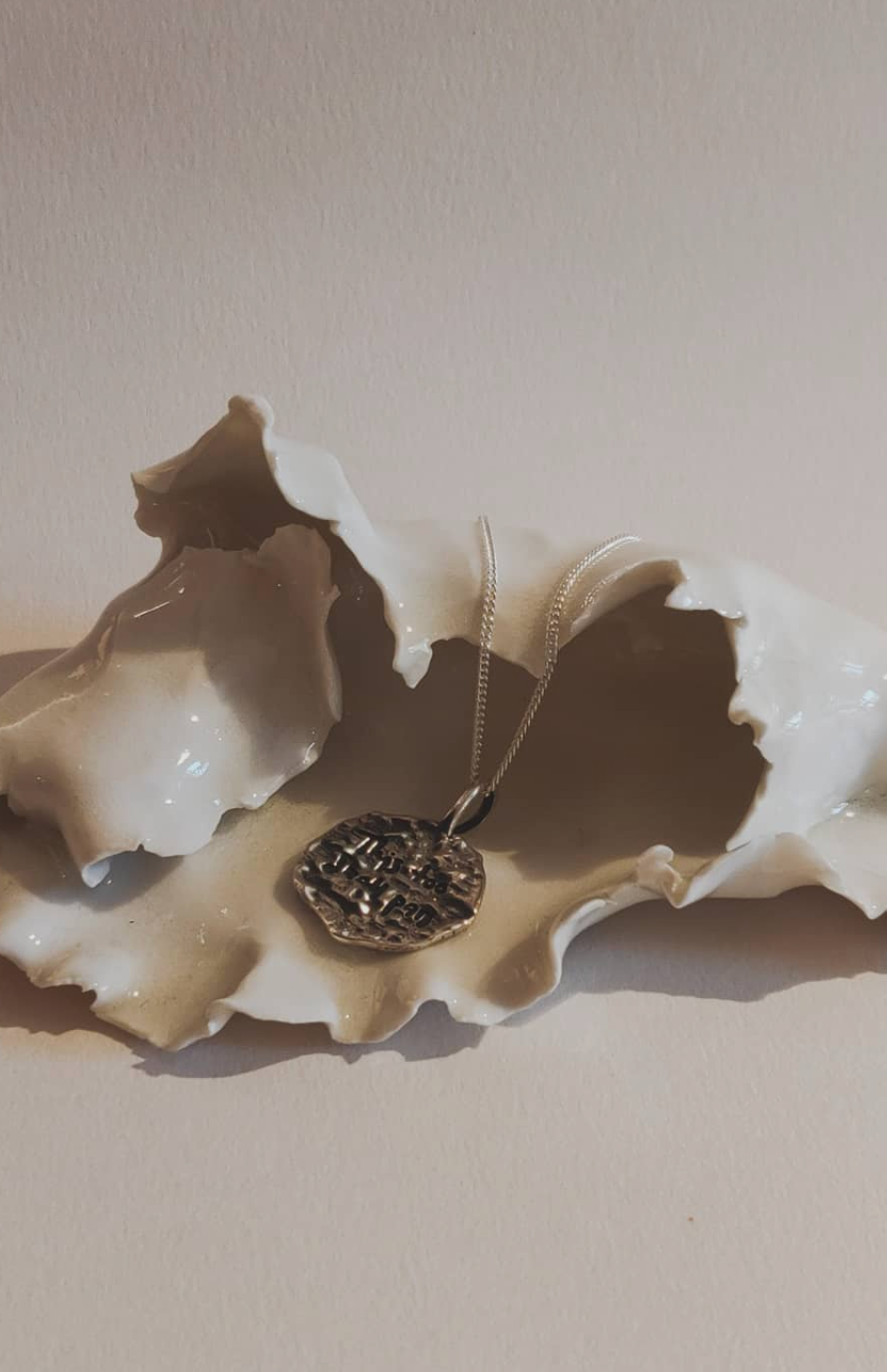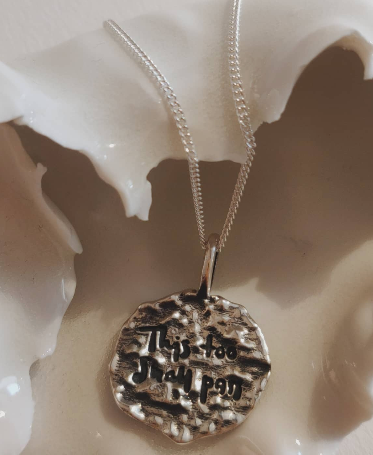 Halsband med myntformat smycke med inskriptionen "This too shall pass".