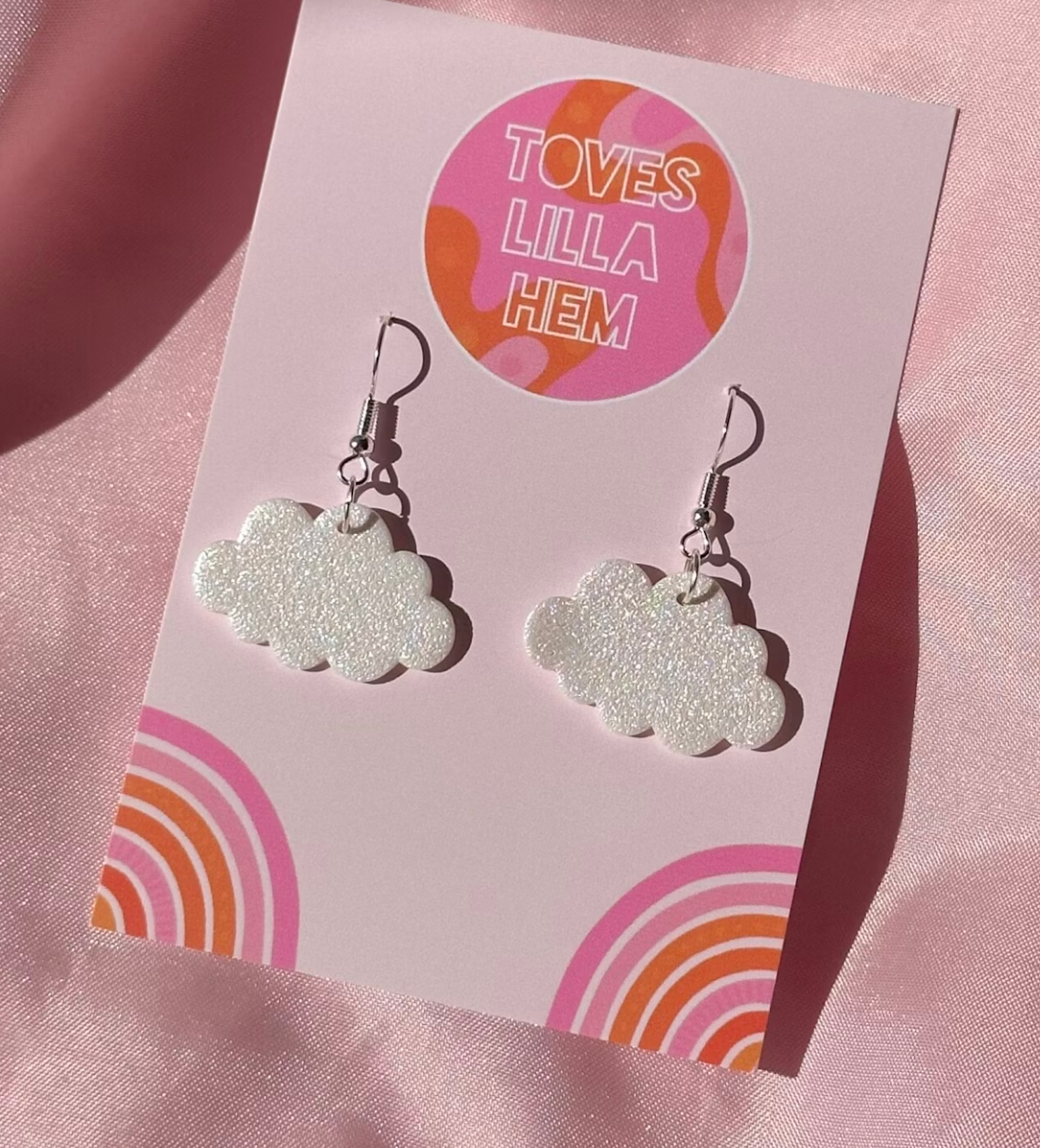 Örhänge i enkel molnform, tillverkad i polymerlera, ett material som är otroligt lätt och skönt att bära. Bakstycke av kirurgiskt stål som är både nickelfritt och allergivänligt.