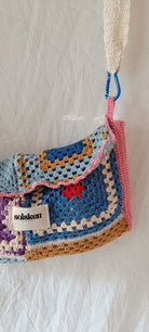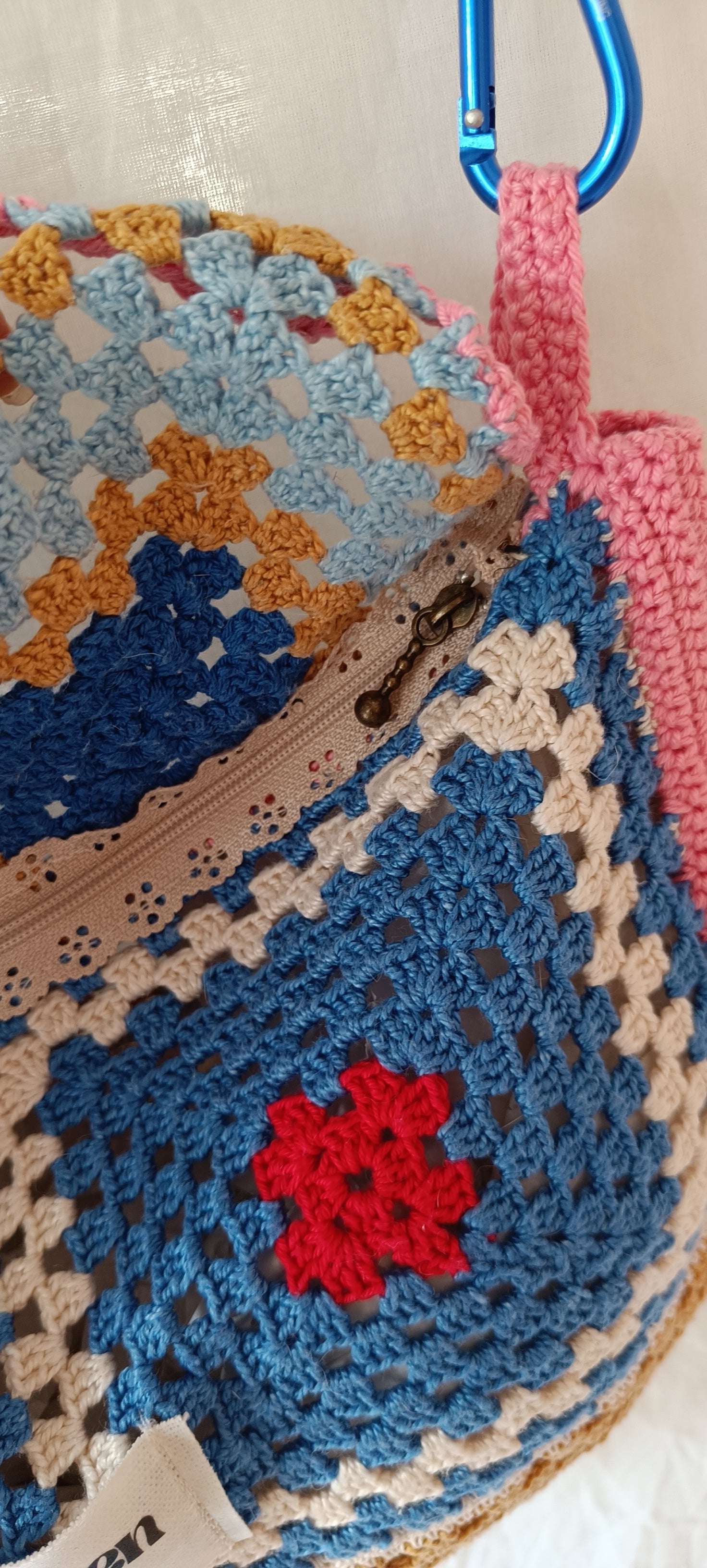 Handvirkad väska av återbruksmaterial (allt utom dragkedja och karbinhake). Väskan är en one-of a kind och handgjord på Gotland.