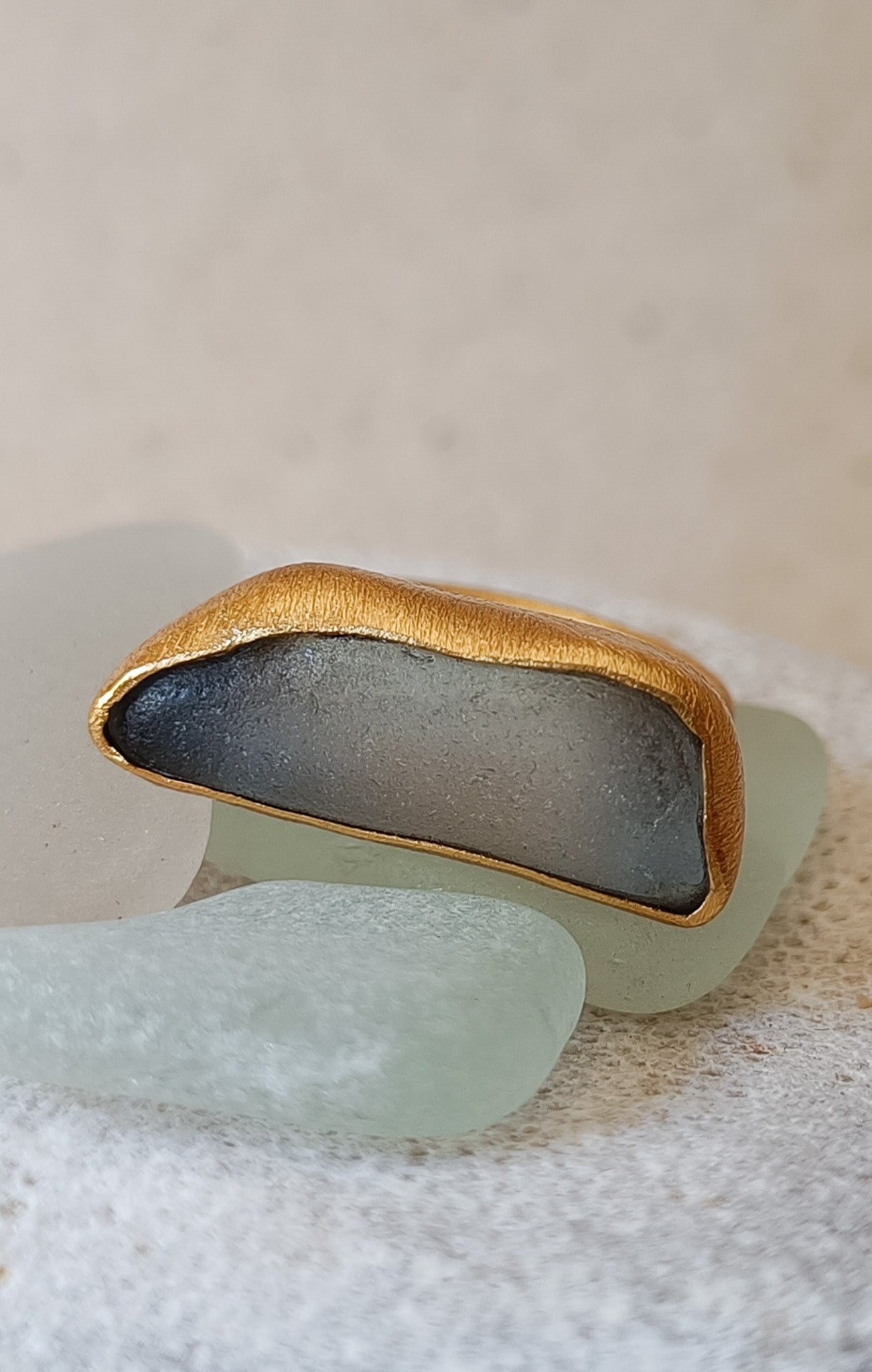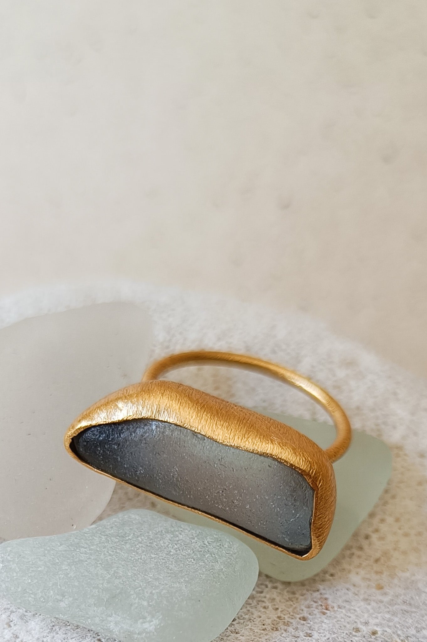 Denna ring har en grå/vit sten och är helt unik. Stenen är en slipad glasbit som hittats på en av jordens alla stränder, skattjakt när det är som bäst helt enkelt! Också ett återbruk som blev en unik och limiterad kollektion. Hoppas du älskar den lika mycket som jag gjorde att ta fram den!