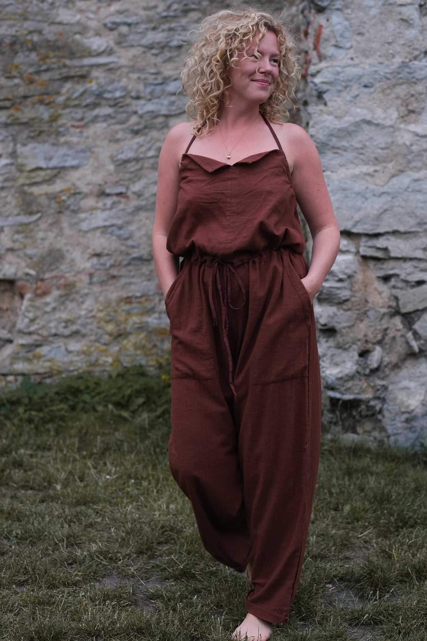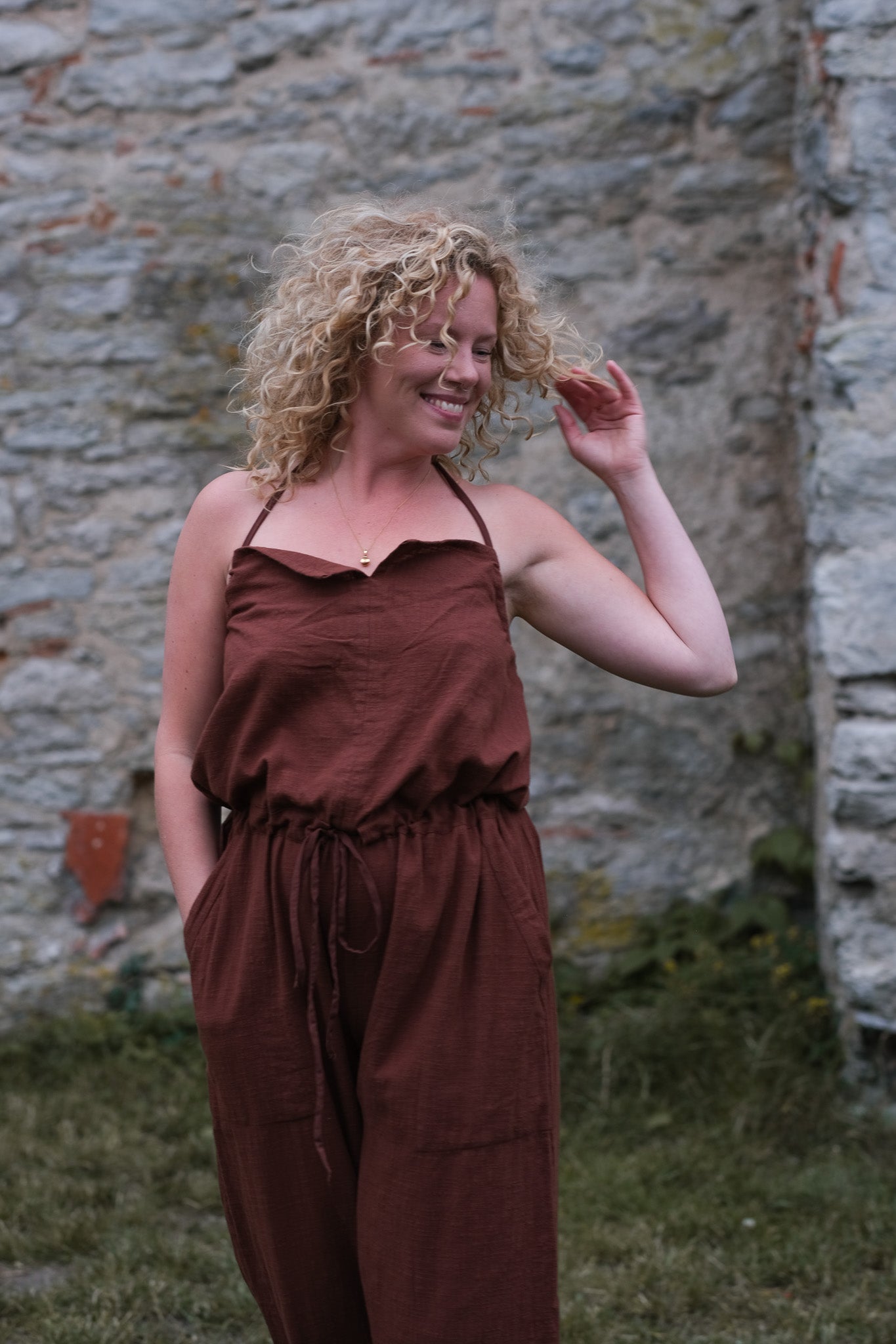 En jumpsuit att ha både på stranden, på stan eller på fest - allt beror på hur du stylar den. Bär den som den är eller med en t-shirt eller ett linne under. Framsidan har en skuren detalj, justerbara axelband som knyts halterneck, avslappnade ben, sidfickor framtill och ett insytt band i midjan som du kan dra åt för att framhäva midjan om det önskas.