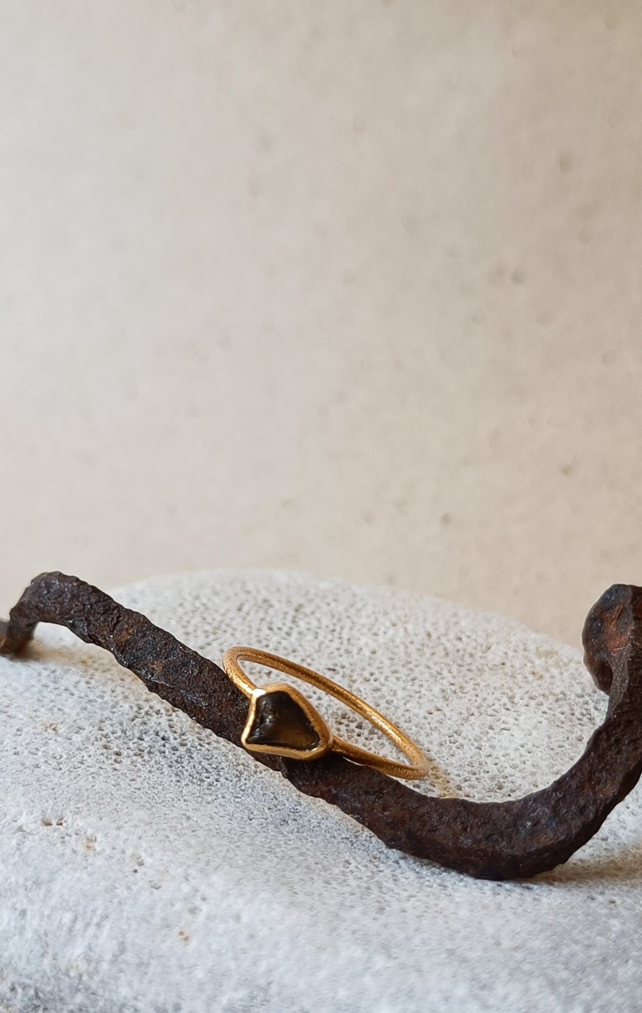 Denna ring har en brun/grön sten och är helt unik. Stenen är en slipad glasbit som hittats på en av jordens alla stränder, skattjakt när det är som bäst helt enkelt! Också ett återbruk som blev en unik och limiterad kollektion. Hoppas du älskar den lika mycket som jag gjorde att ta fram den!