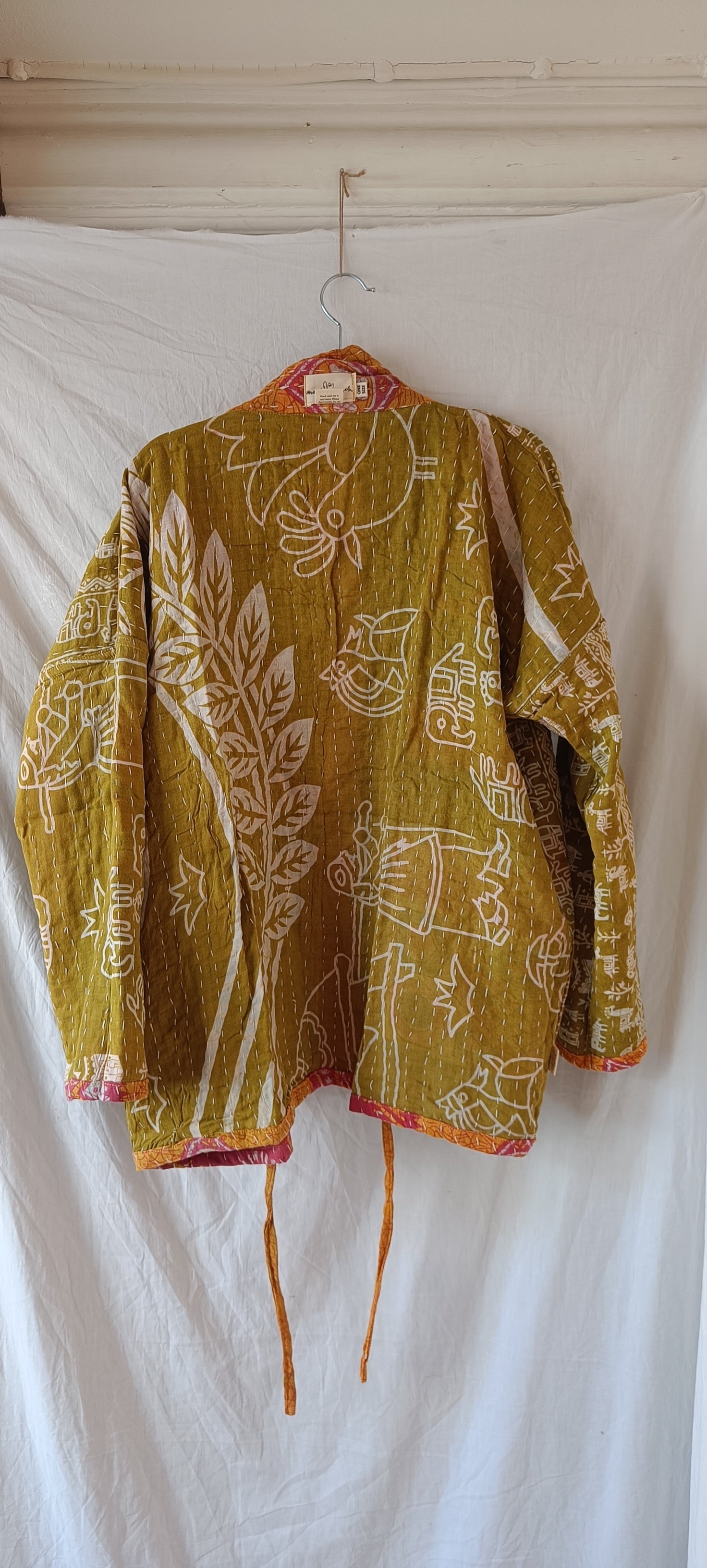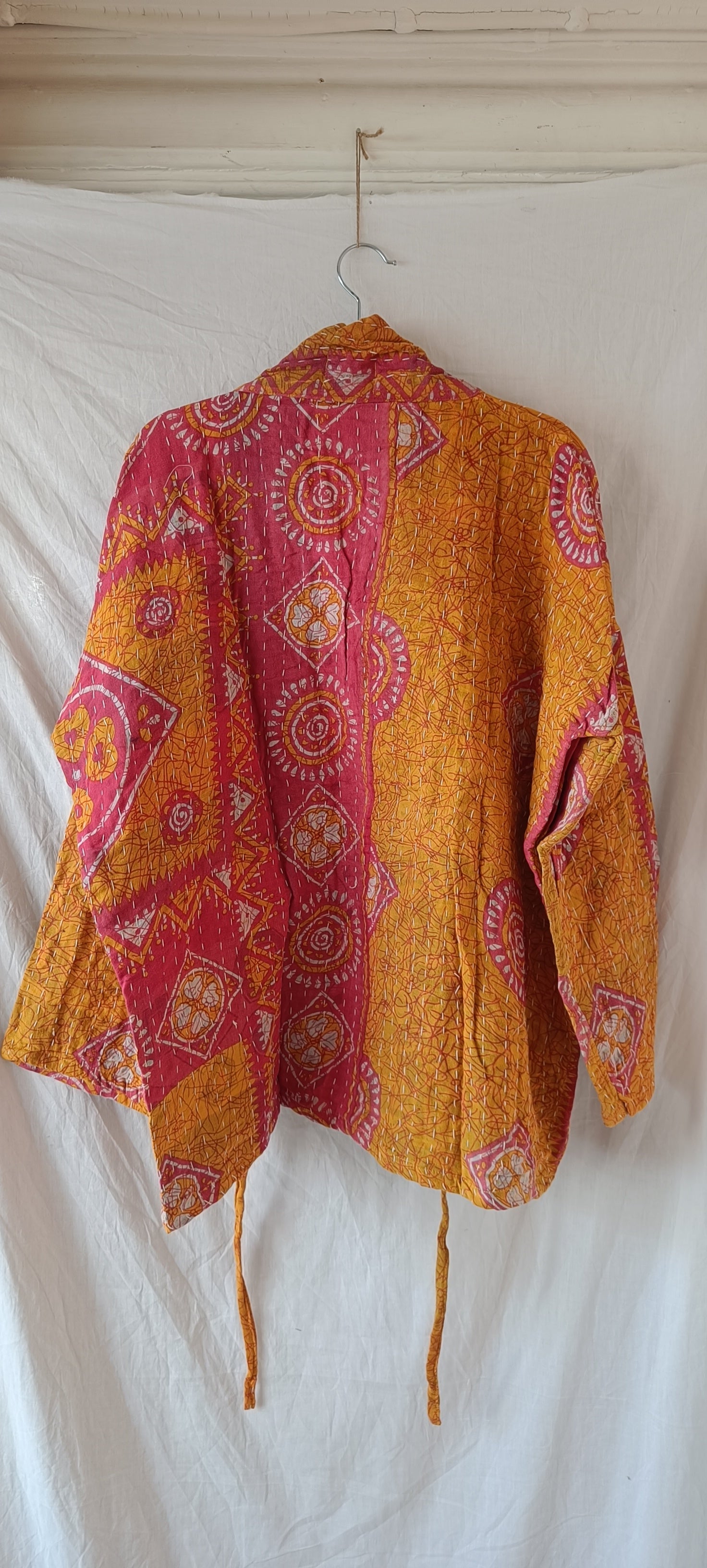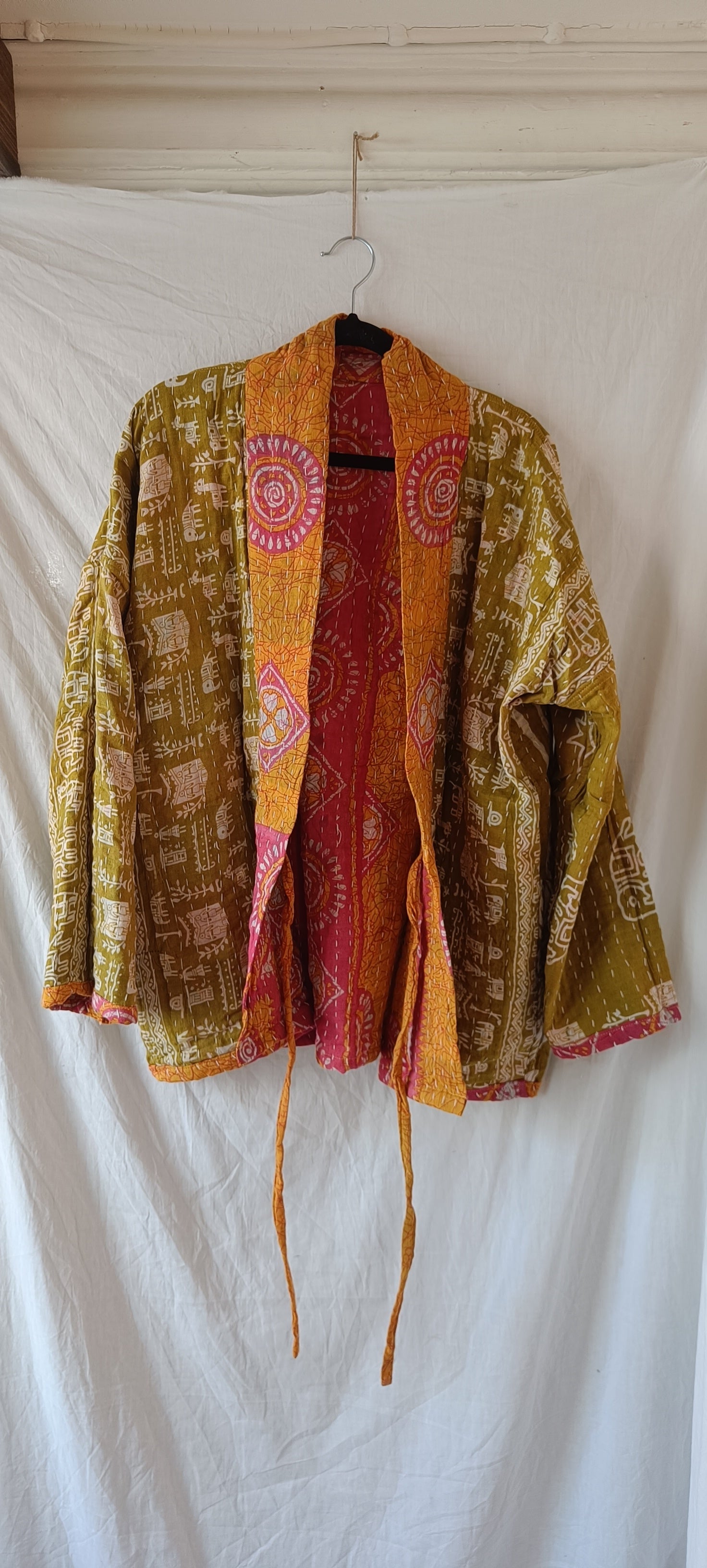 Helt unik kanthajacka i bomull. Gjord av handplockade kanthafiltar från norra Indien. Tyget räcker enbart till en jacka i just det här utförandet, vilket innebär att varenda en är helt one-of a kind. Jackan är vändbar (något jag älskade med 90-talets kläder och försöker få tillbaka!), har två stora fickor på ena framsidan samt snören som går att knyta framtill så jackan stängs.