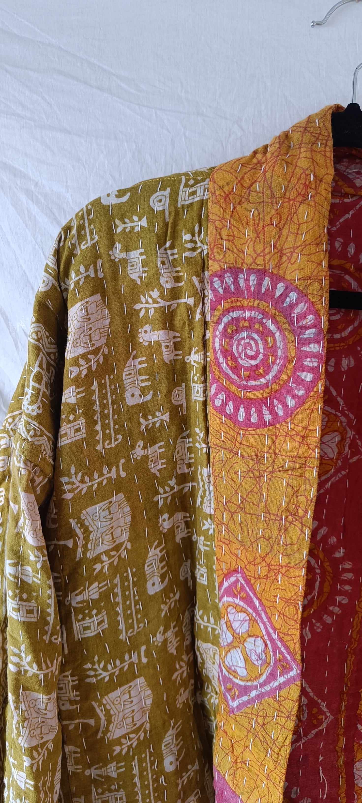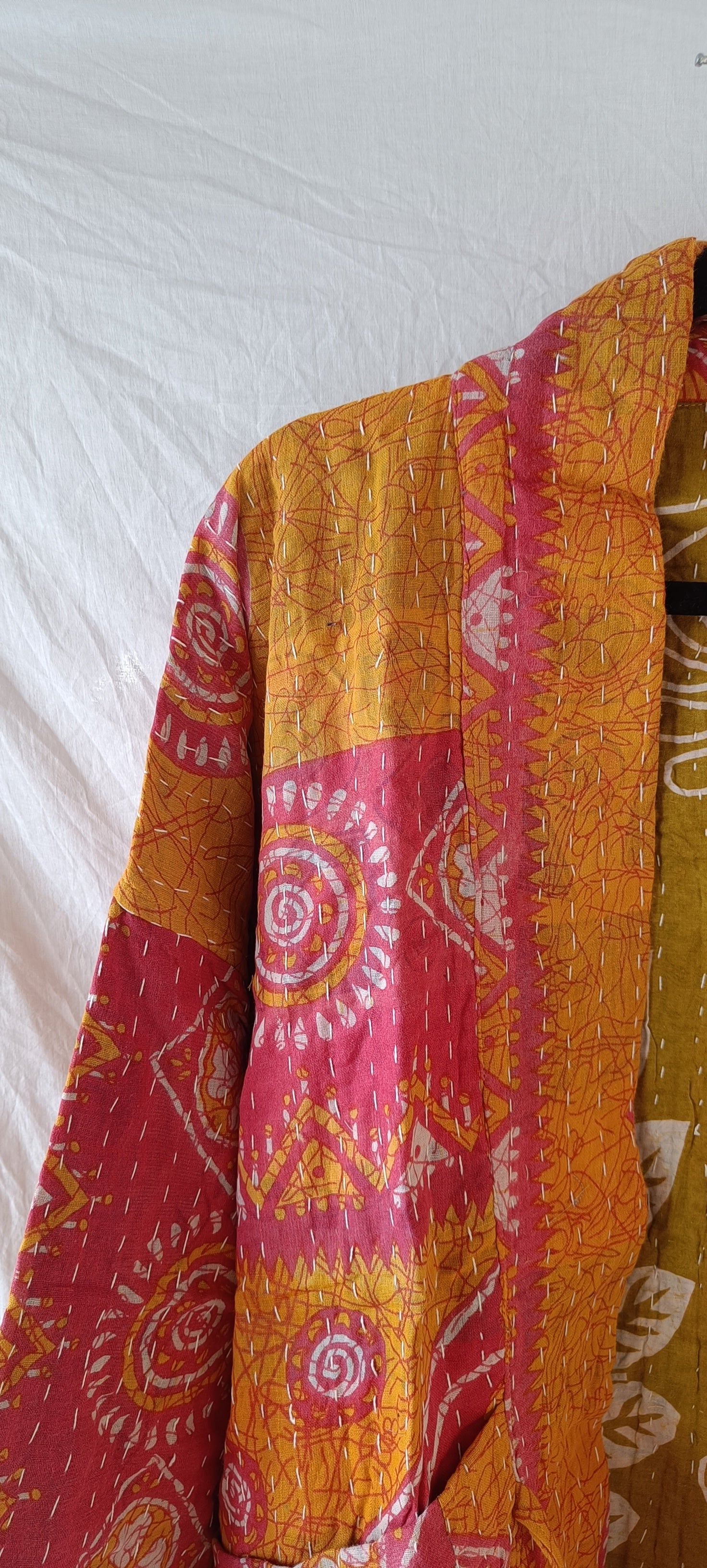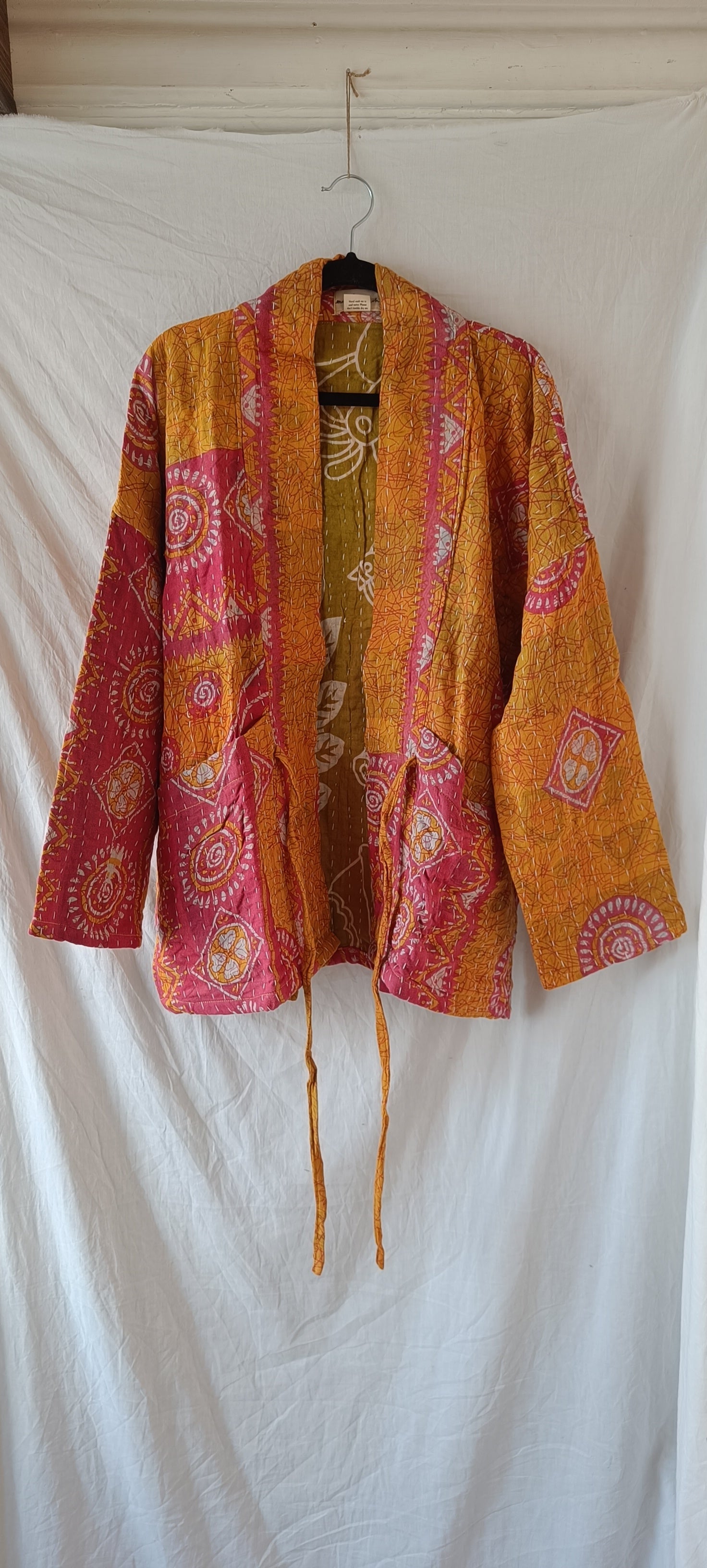 Helt unik kanthajacka i bomull. Gjord av handplockade kanthafiltar från norra Indien. Tyget räcker enbart till en jacka i just det här utförandet, vilket innebär att varenda en är helt one-of a kind. Jackan är vändbar (något jag älskade med 90-talets kläder och försöker få tillbaka!), har två stora fickor på ena framsidan samt snören som går att knyta framtill så jackan stängs.