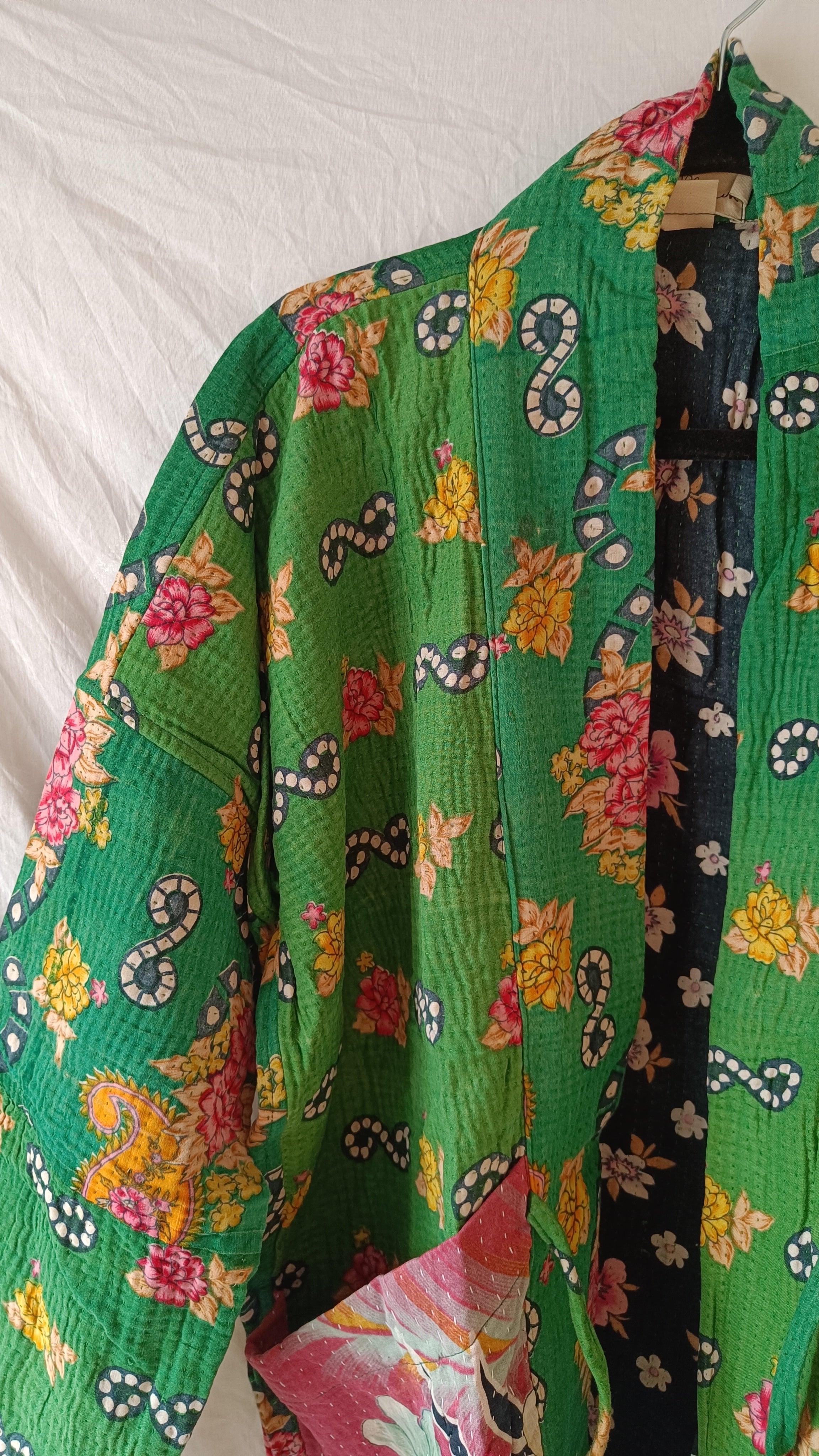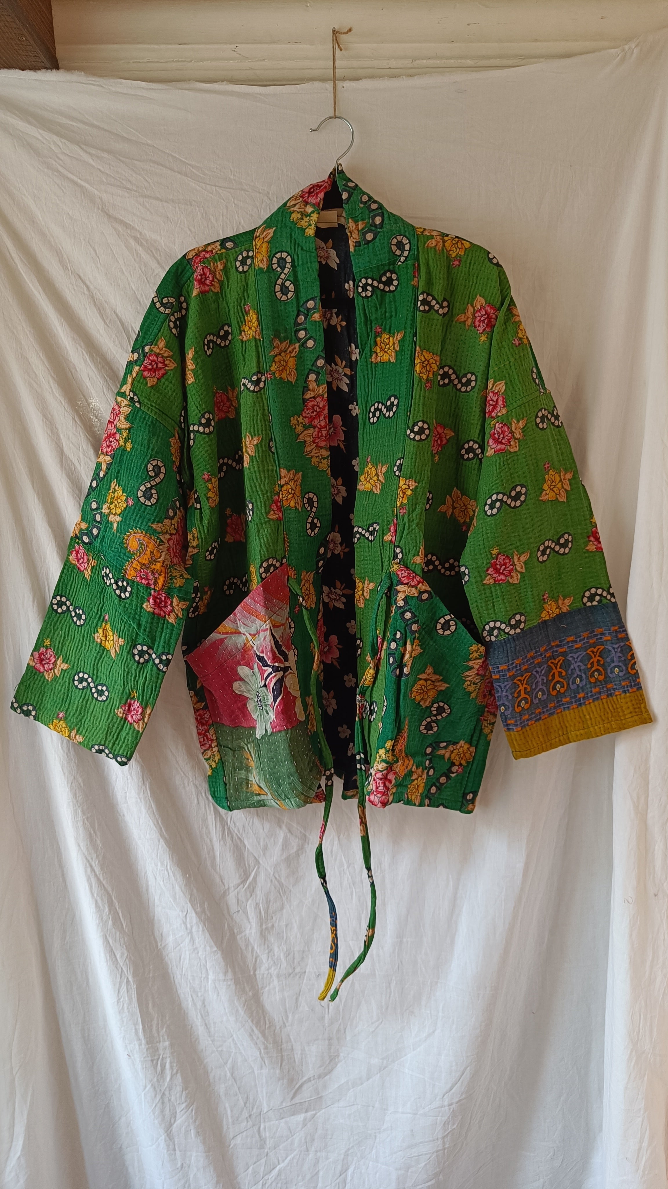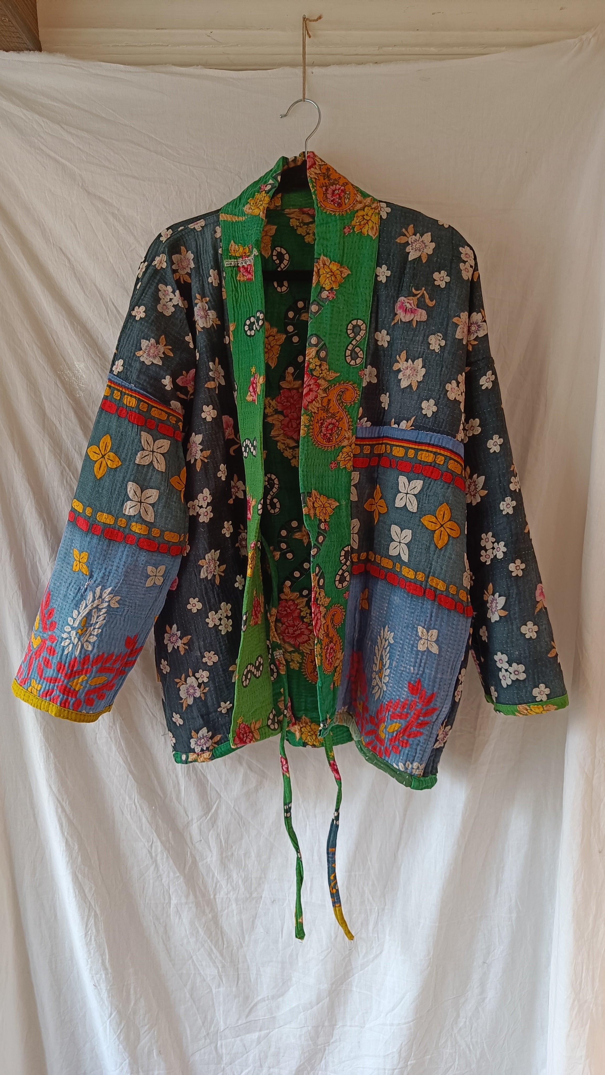 Helt unik kanthajacka i bomull. Gjord av handplockade kanthafiltar från norra Indien. Tyget räcker enbart till en jacka i just det här utförandet, vilket innebär att varenda en är helt one-of a kind. Jackan är vändbar (något jag älskade med 90-talets kläder och försöker få tillbaka!), har två stora fickor på ena framsidan samt snören som går att knyta framtill så jackan stängs.