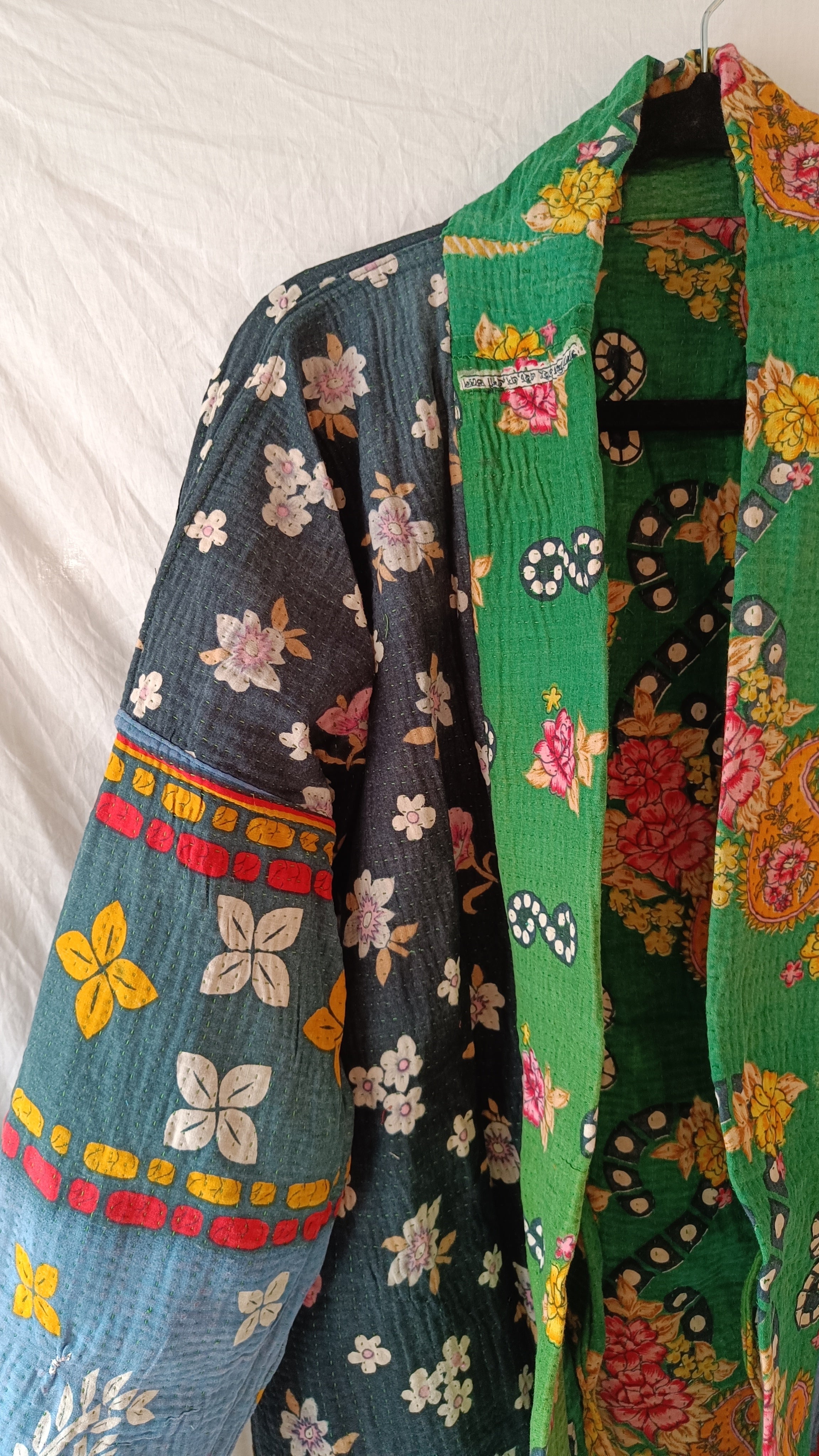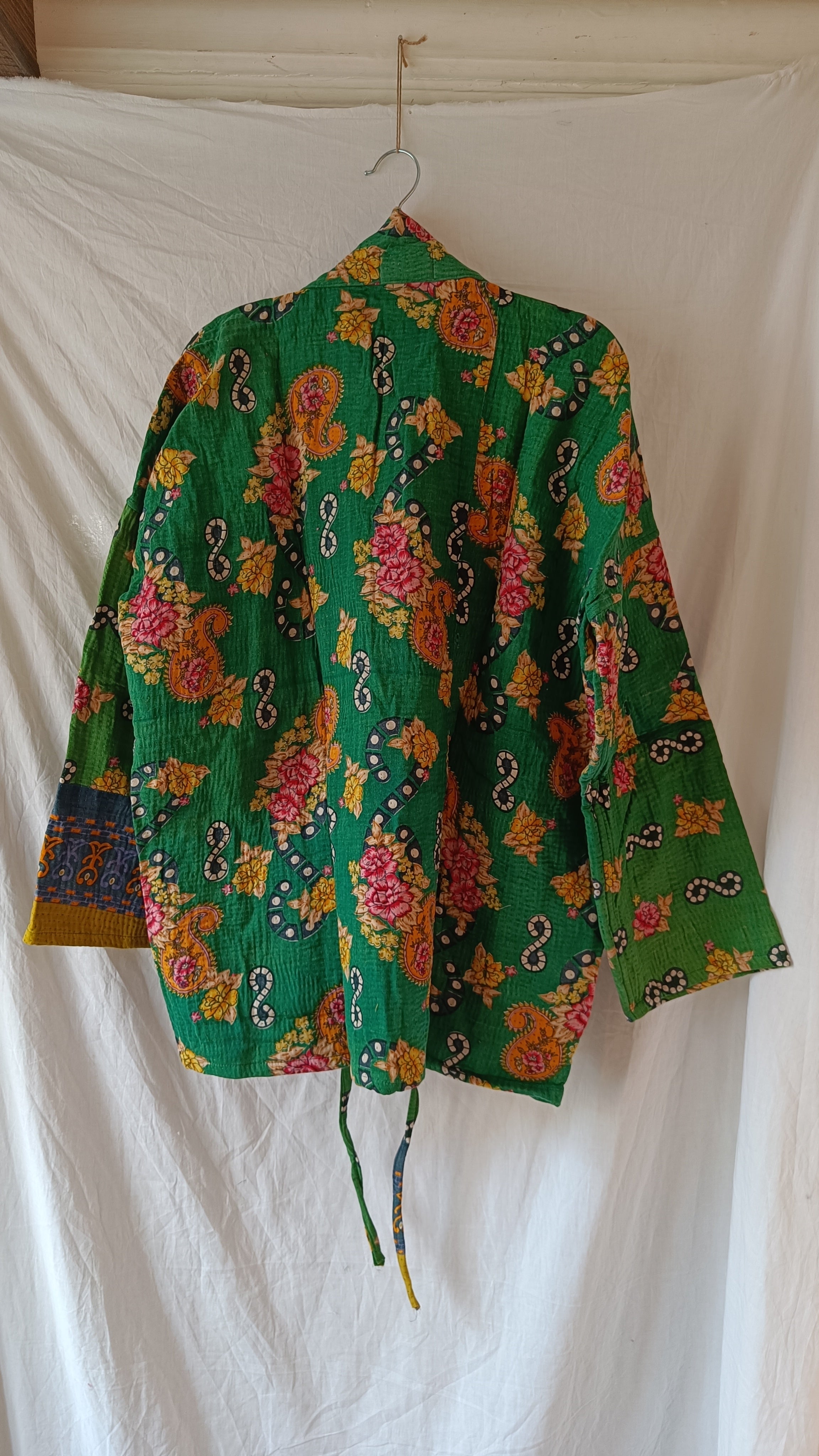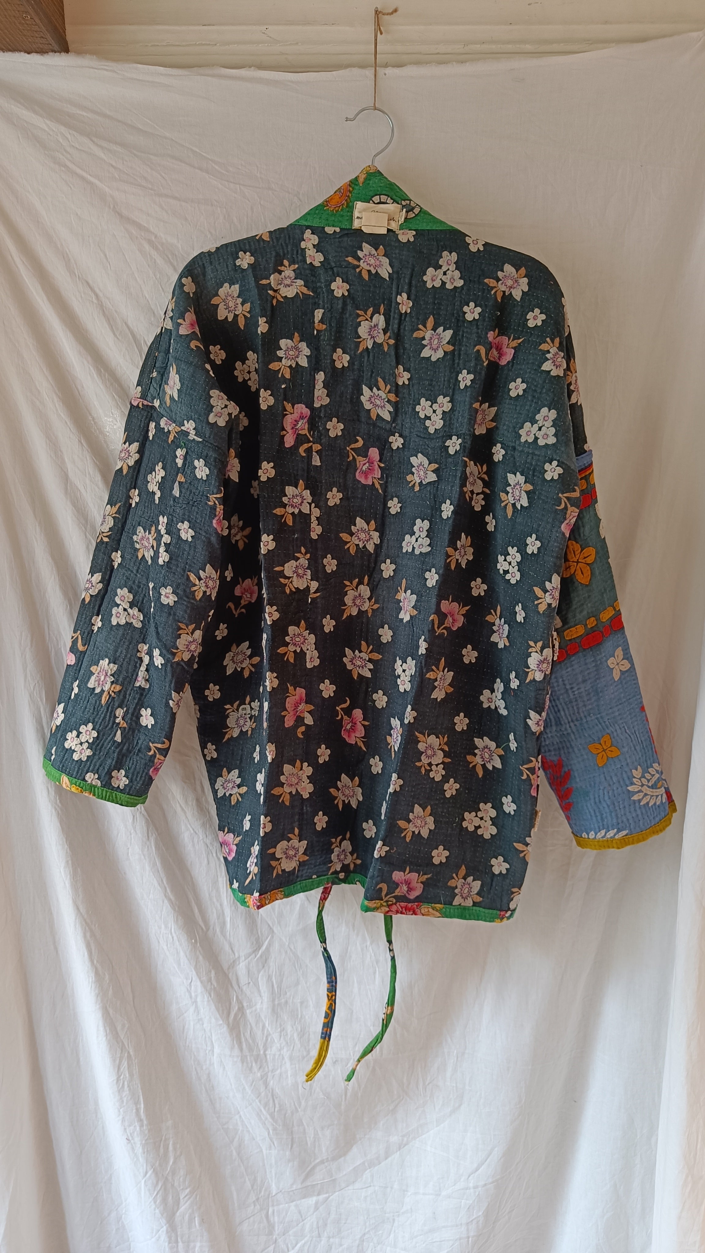 Helt unik kanthajacka i bomull. Gjord av handplockade kanthafiltar från norra Indien. Tyget räcker enbart till en jacka i just det här utförandet, vilket innebär att varenda en är helt one-of a kind. Jackan är vändbar (något jag älskade med 90-talets kläder och försöker få tillbaka!), har två stora fickor på ena framsidan samt snören som går att knyta framtill så jackan stängs.
