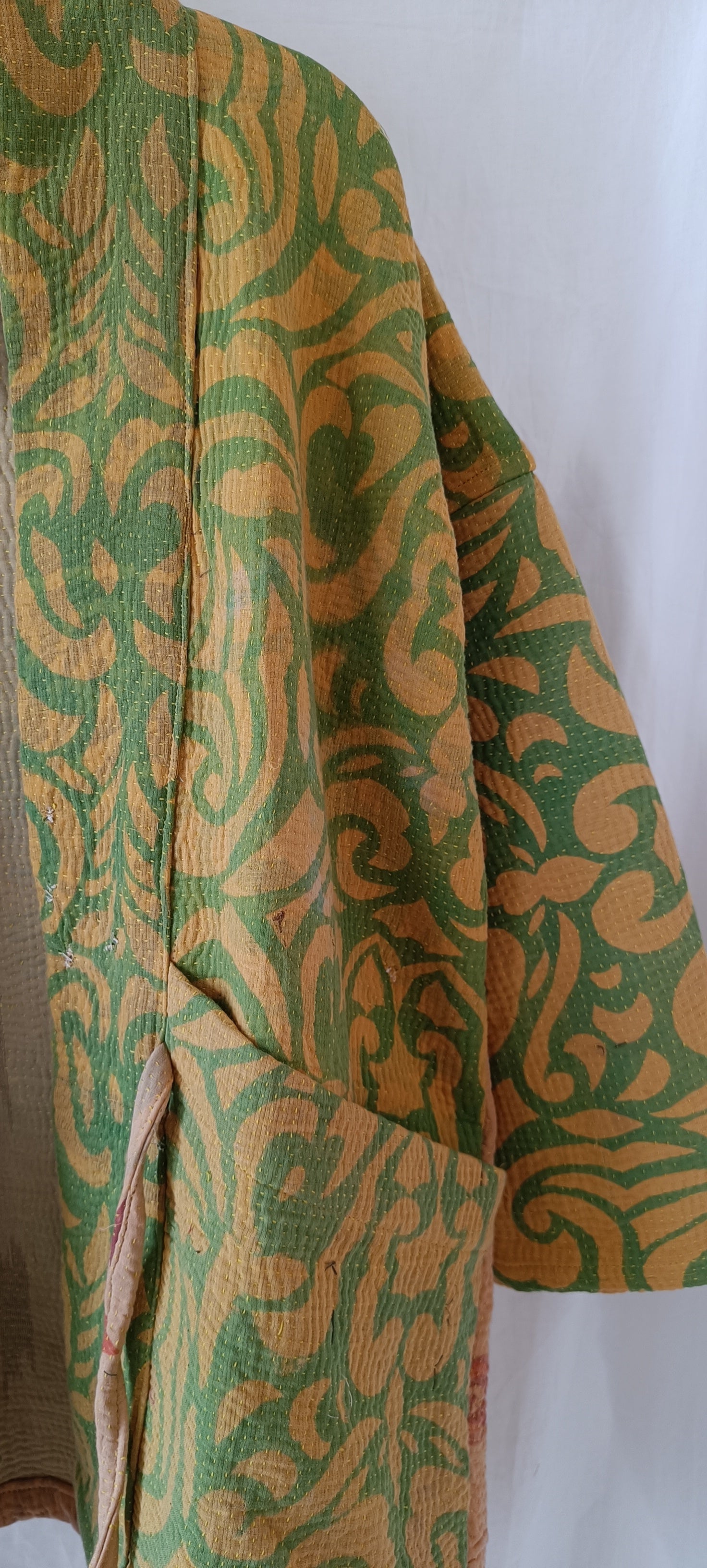 Helt unik kanthajacka i bomull. Gjord av handplockade kanthafiltar från norra Indien. Tyget räcker enbart till en jacka i just det här utförandet, vilket innebär att varenda en är helt one-of a kind. Jackan är vändbar (något jag älskade med 90-talets kläder och försöker få tillbaka!), har två stora fickor på ena framsidan samt snören som går att knyta framtill så jackan stängs.