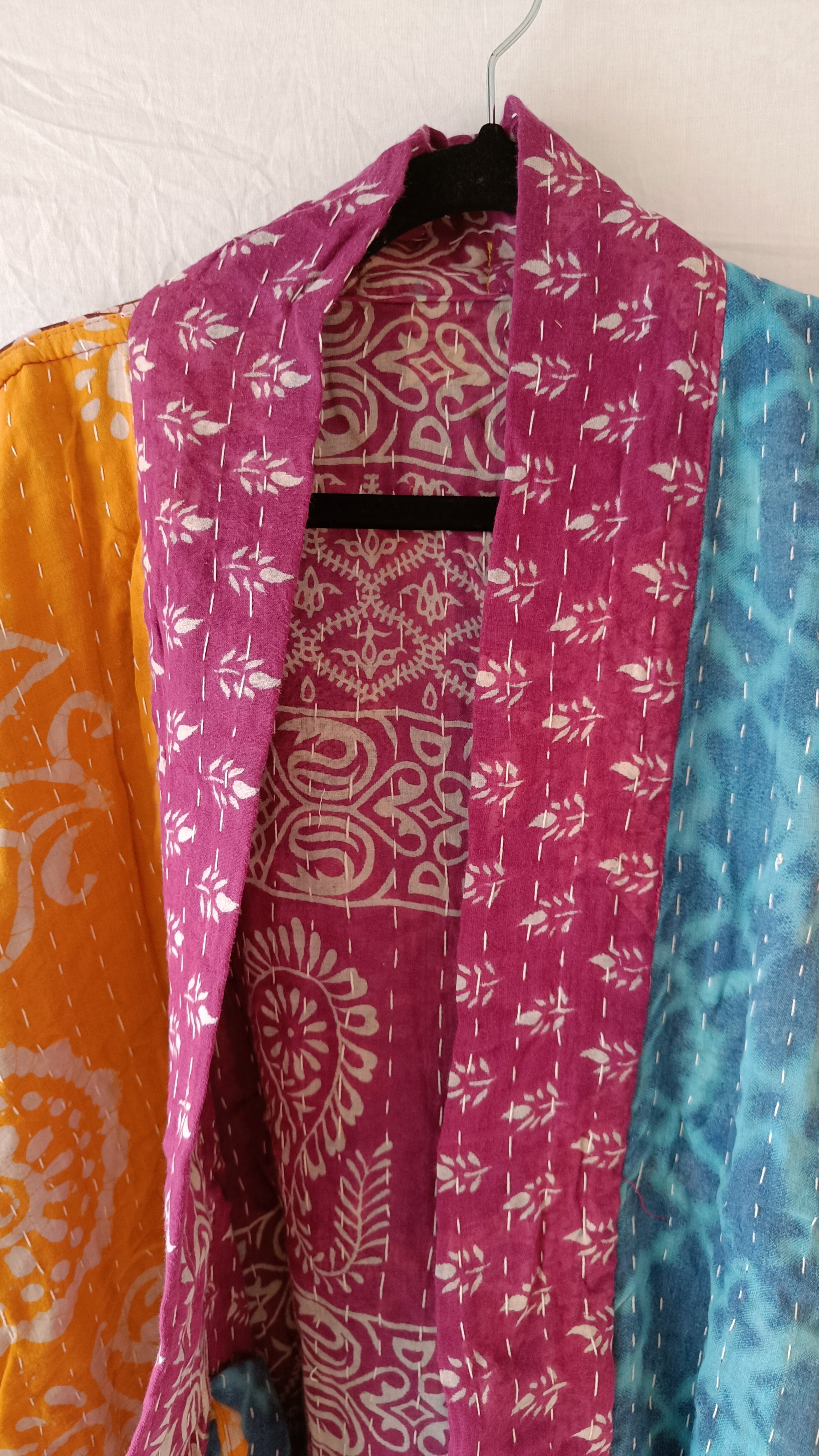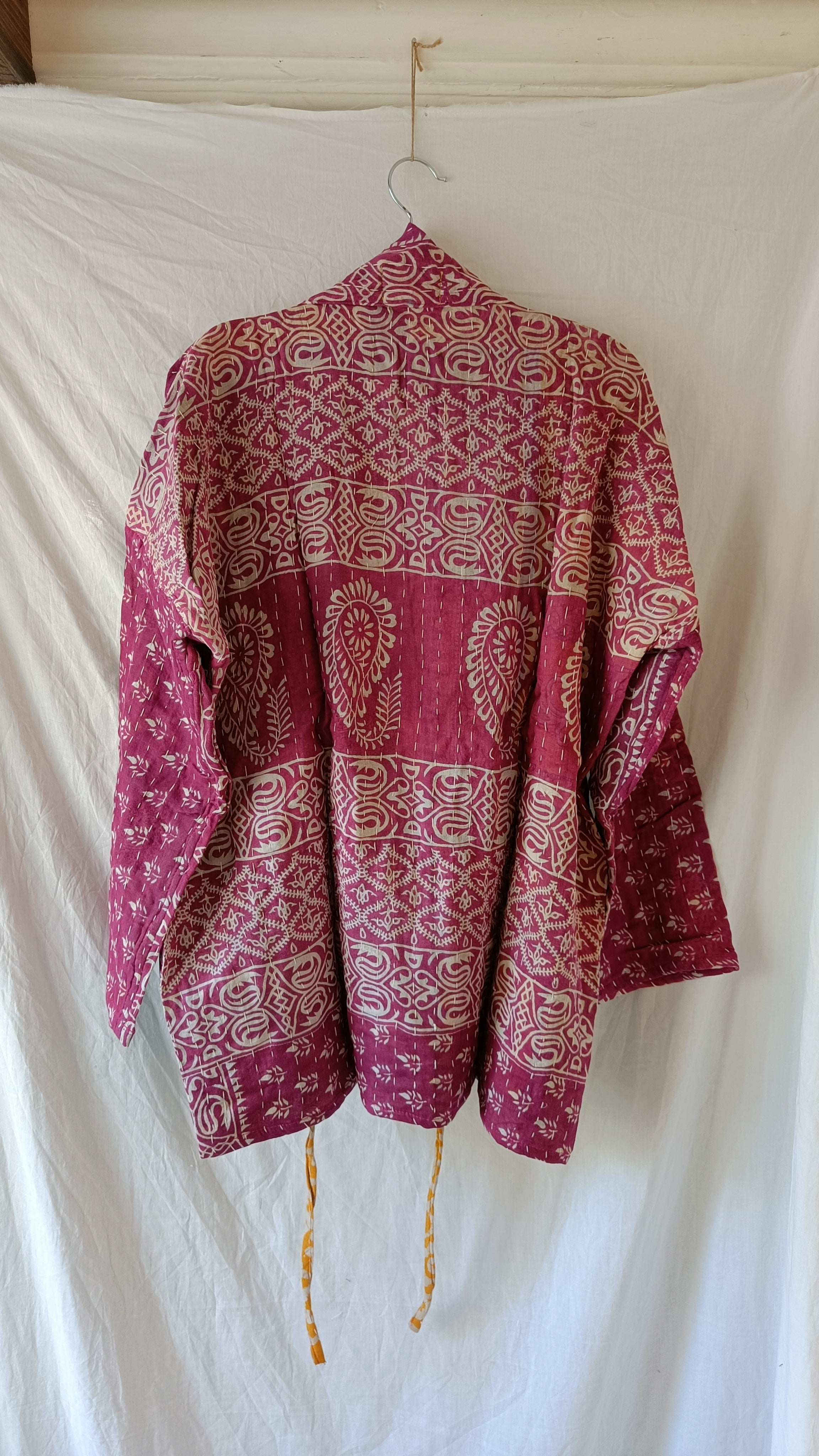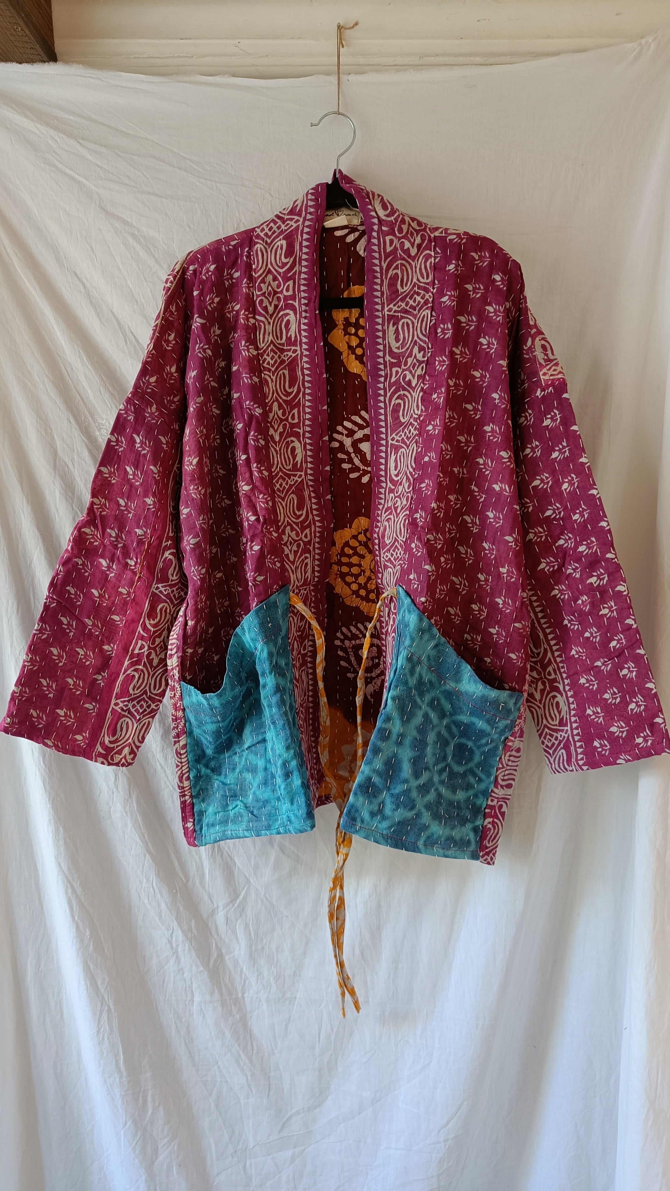 Helt unik kanthajacka i bomull. Gjord av handplockade kanthafiltar från norra Indien. Tyget räcker enbart till en jacka i just det här utförandet, vilket innebär att varenda en är helt one-of a kind. Jackan är vändbar (något jag älskade med 90-talets kläder och försöker få tillbaka!), har två stora fickor på ena framsidan samt snören som går att knyta framtill så jackan stängs.