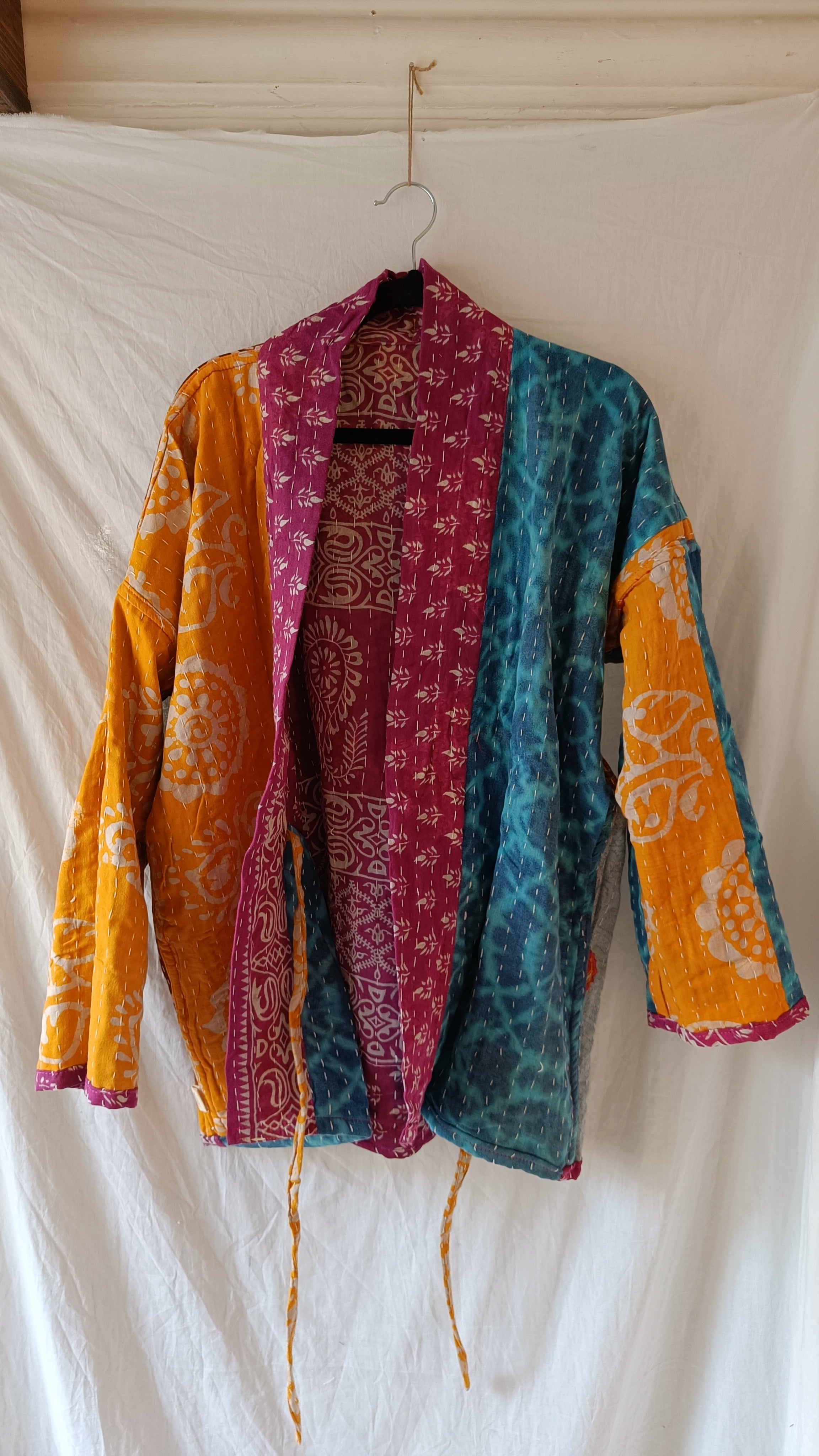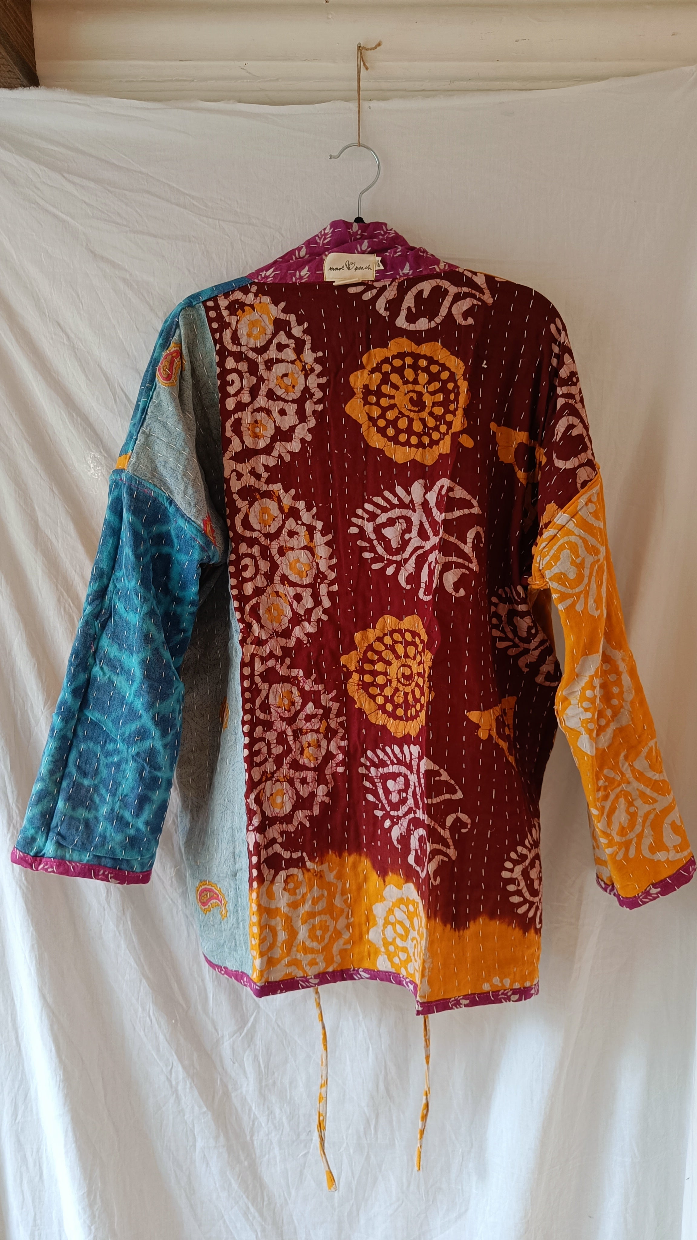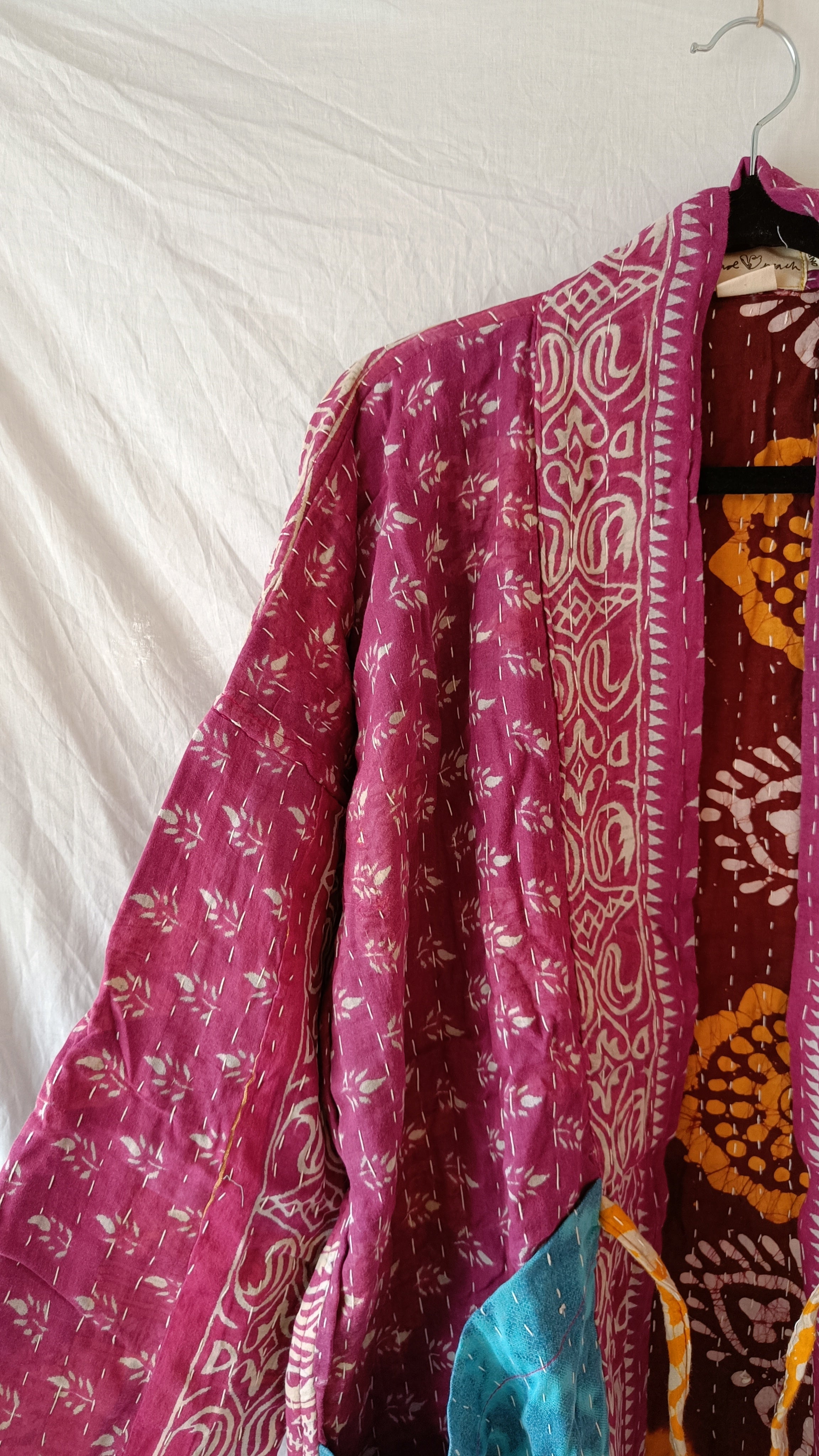 Helt unik kanthajacka i bomull. Gjord av handplockade kanthafiltar från norra Indien. Tyget räcker enbart till en jacka i just det här utförandet, vilket innebär att varenda en är helt one-of a kind. Jackan är vändbar (något jag älskade med 90-talets kläder och försöker få tillbaka!), har två stora fickor på ena framsidan samt snören som går att knyta framtill så jackan stängs.
