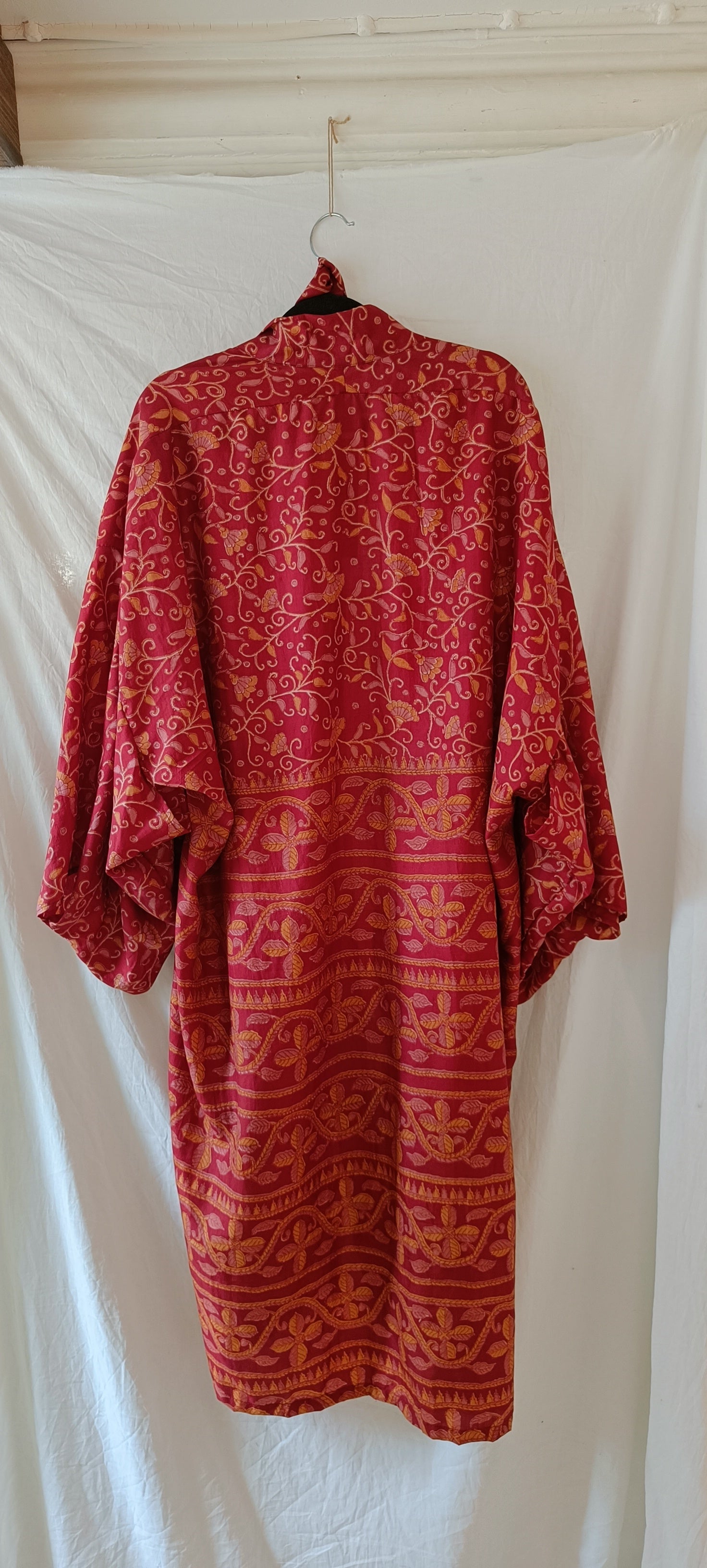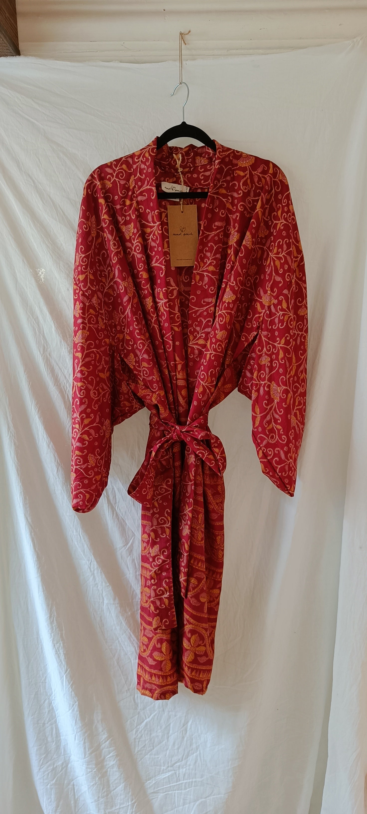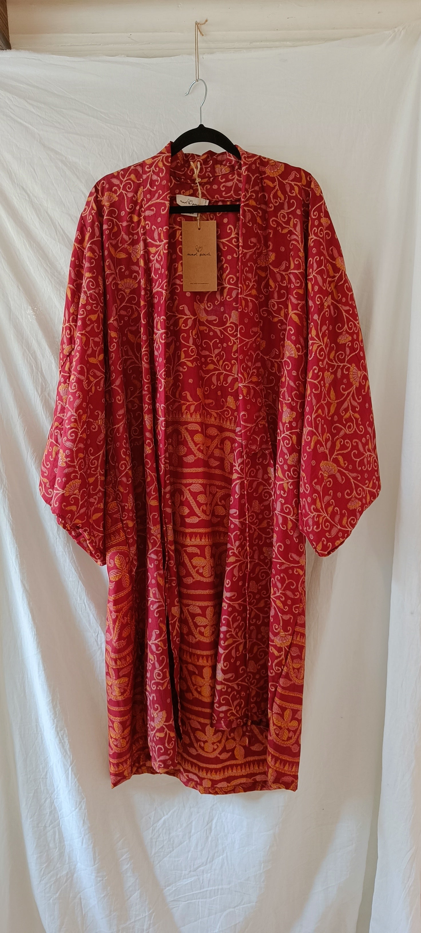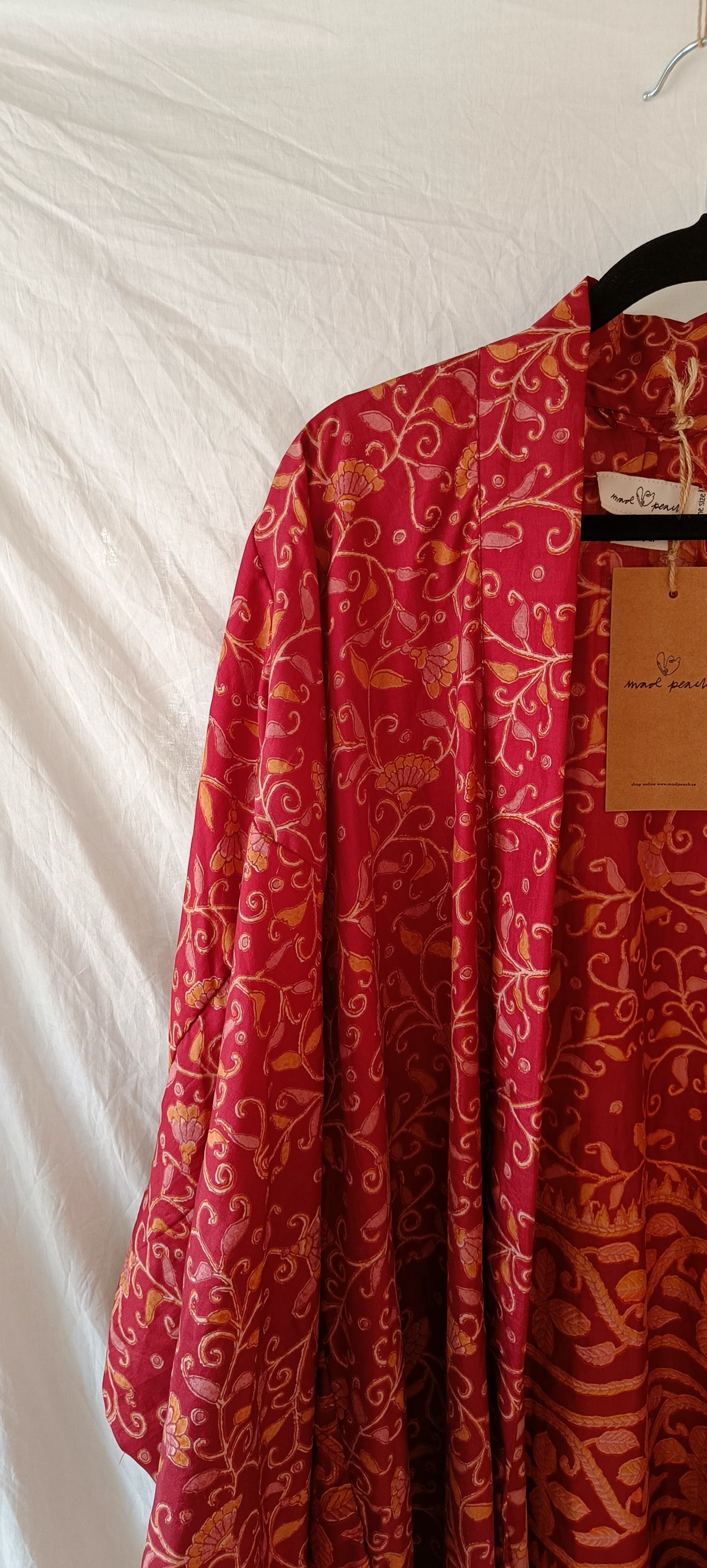 Helt unik kimono gjord av handplockat vintage silke från norra Indien. Tyget räcker enbart till en kimono i just det här utförandet, vilket innebär att varenda en är helt one-of a kind. Modellen är inspirerad av en traditionell japansk kimono och har ett "hål" vid ärmen, där brukade geishorna lägga sina tillhörigheter och använda ärmen som väska (rekommenderas inte med dessa dock då tyget är för skört). Kommer med ett tillhörande bälte för dig som gillar att "wrappa" kimonon runt dig som en klänning. Den är också perfekt till jeans eller över klänning.