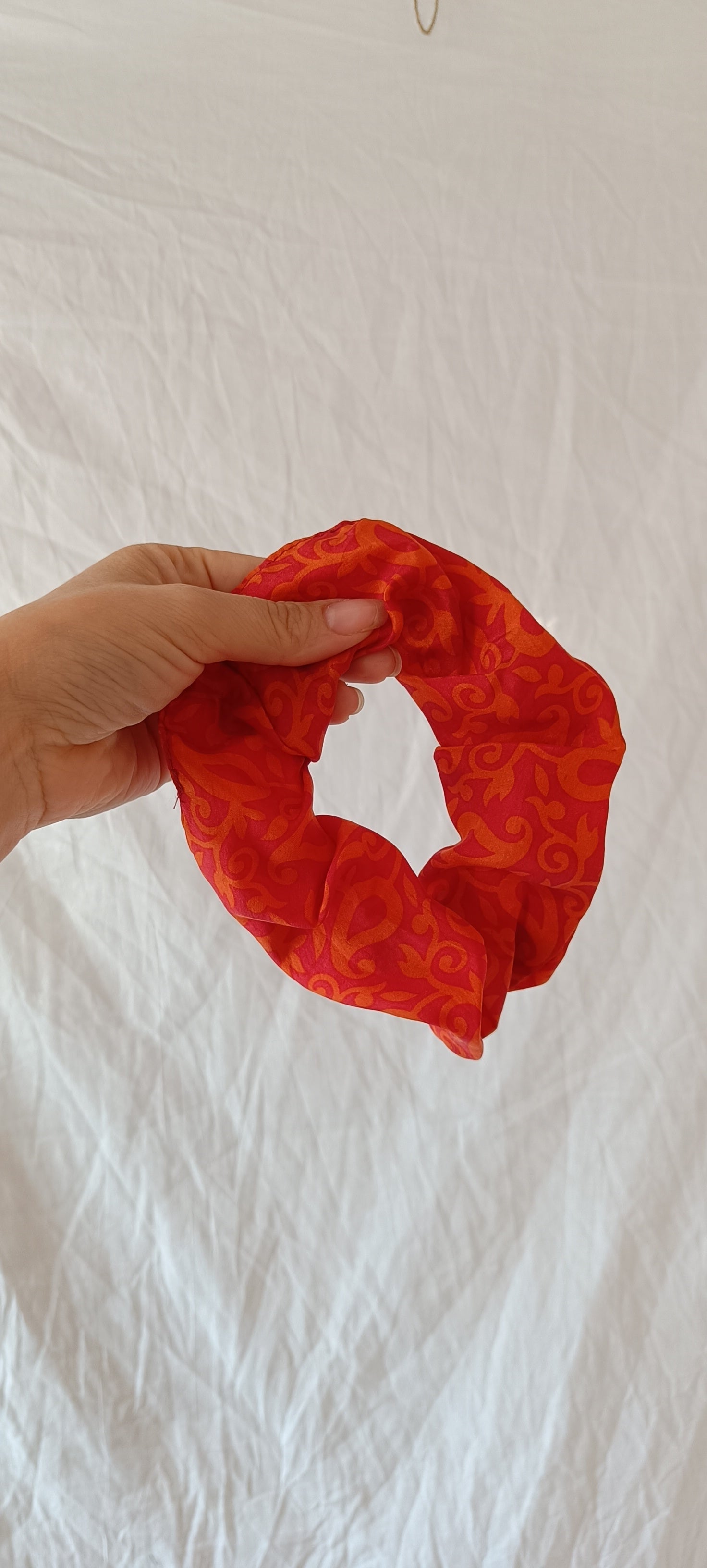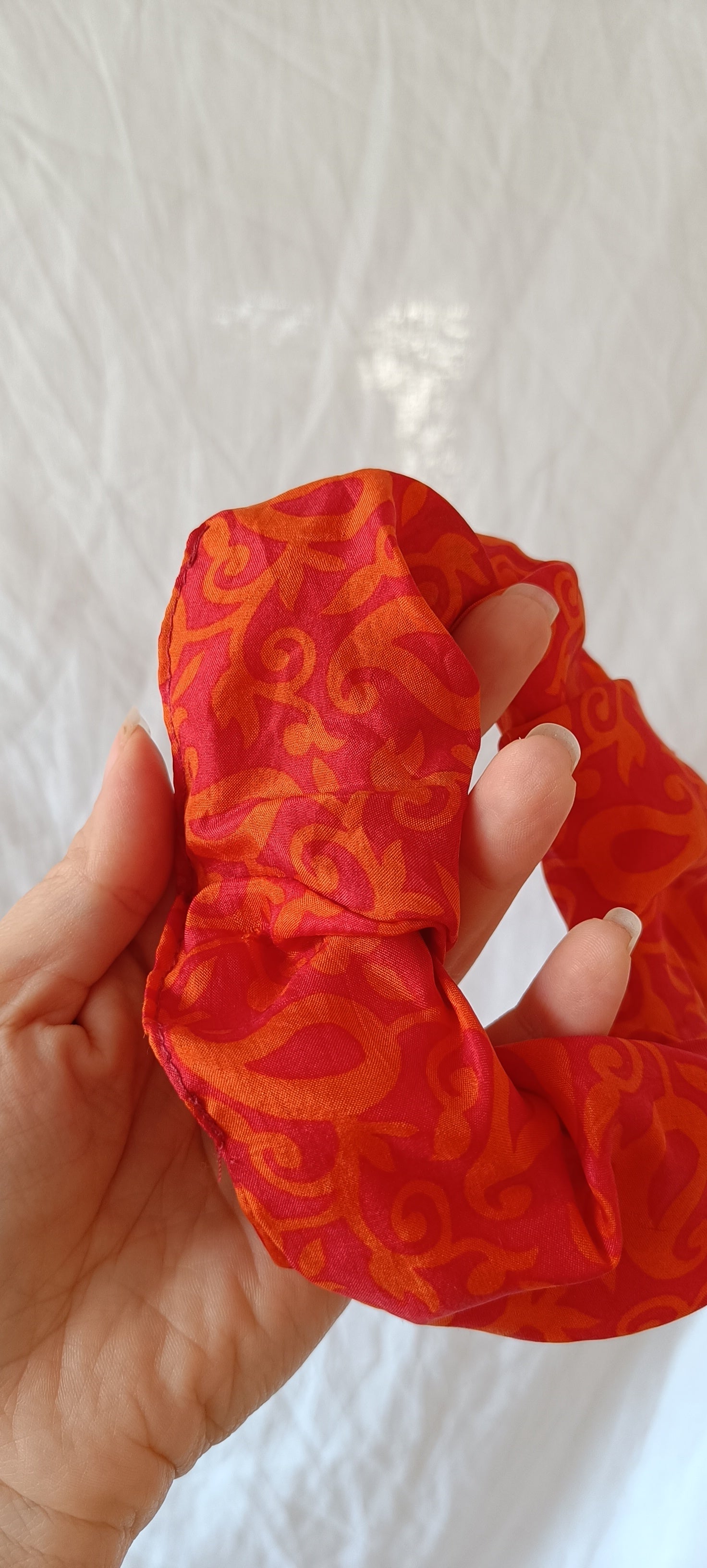 Helt unik scrunchie i vintage silke. Passar perfekt som hårsnodd eller som armband runt handleden när du inte använder den till håret. Pluspoäng för att silke sliter mindre på håret! Gjord av stuvbitar från handplockat vintagesilke från norra Indien.