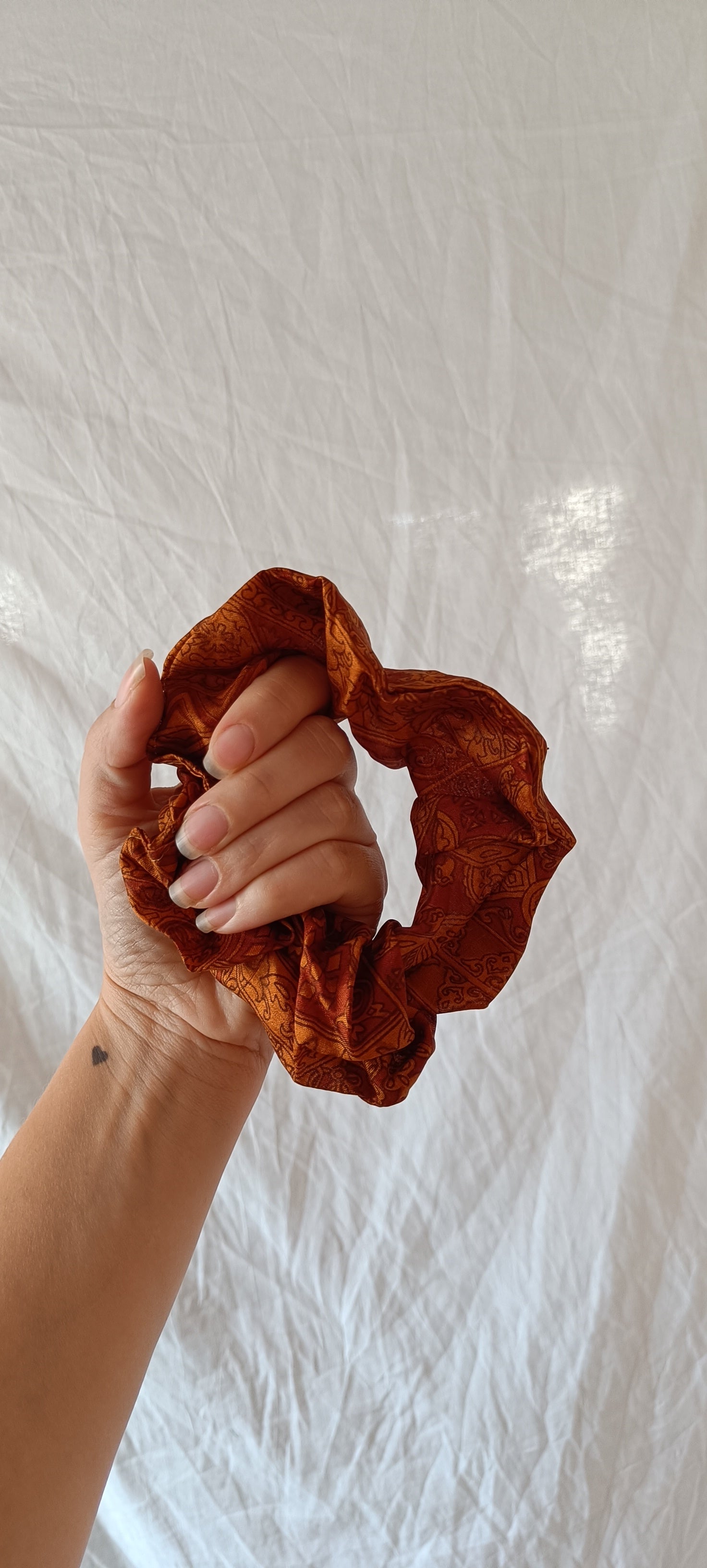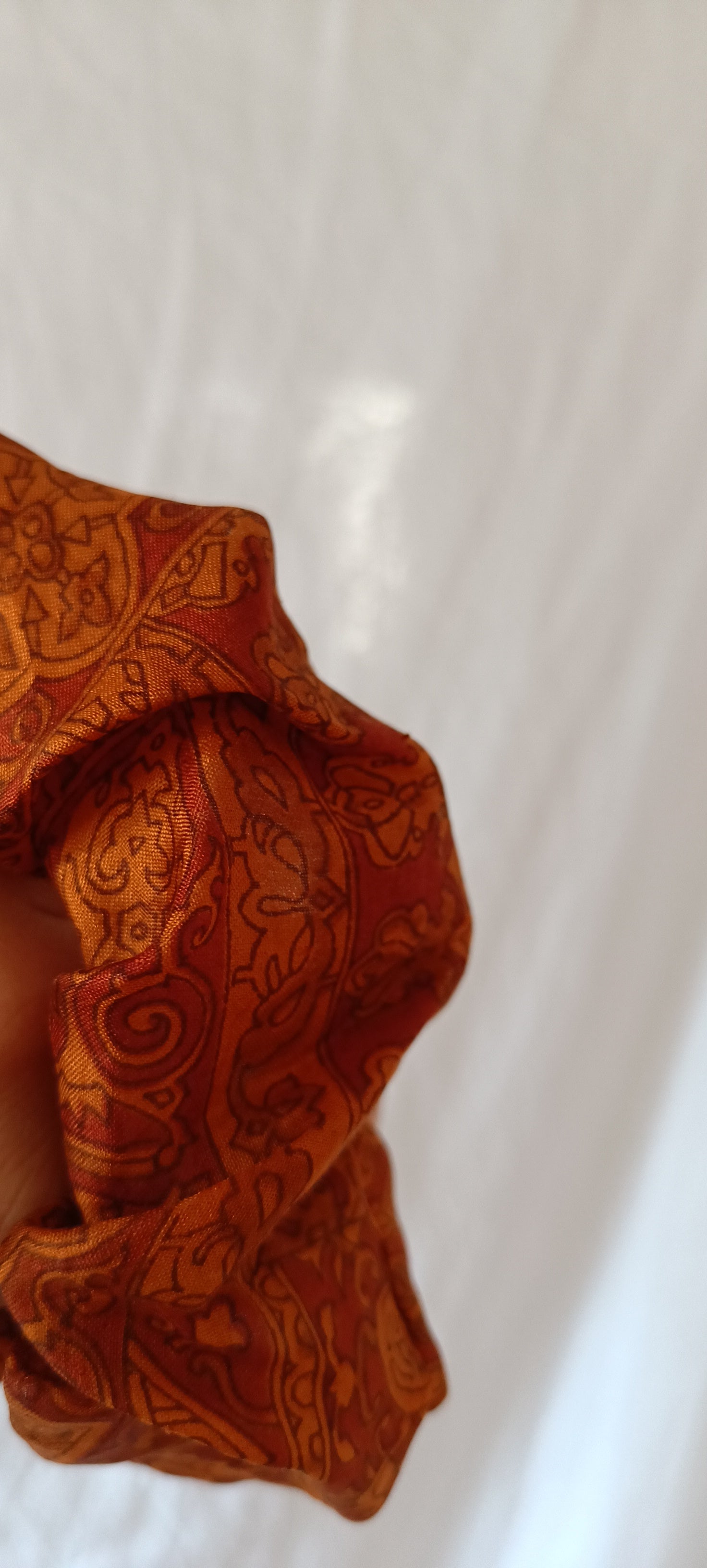 Helt unik scrunchie i vintage silke. Passar perfekt som hårsnodd eller som armband runt handleden när du inte använder den till håret. Pluspoäng för att silke sliter mindre på håret! Gjord av stuvbitar från handplockat vintagesilke från norra Indien.