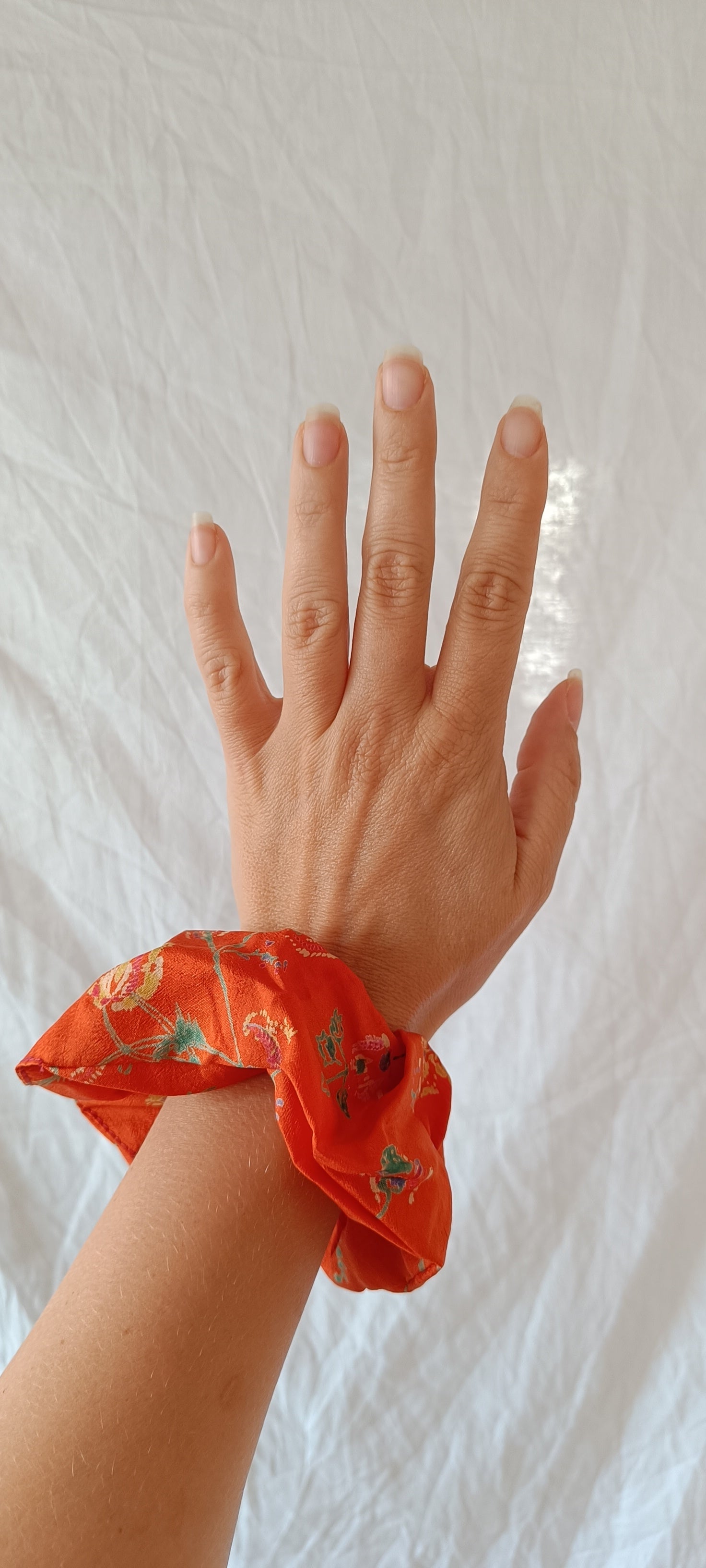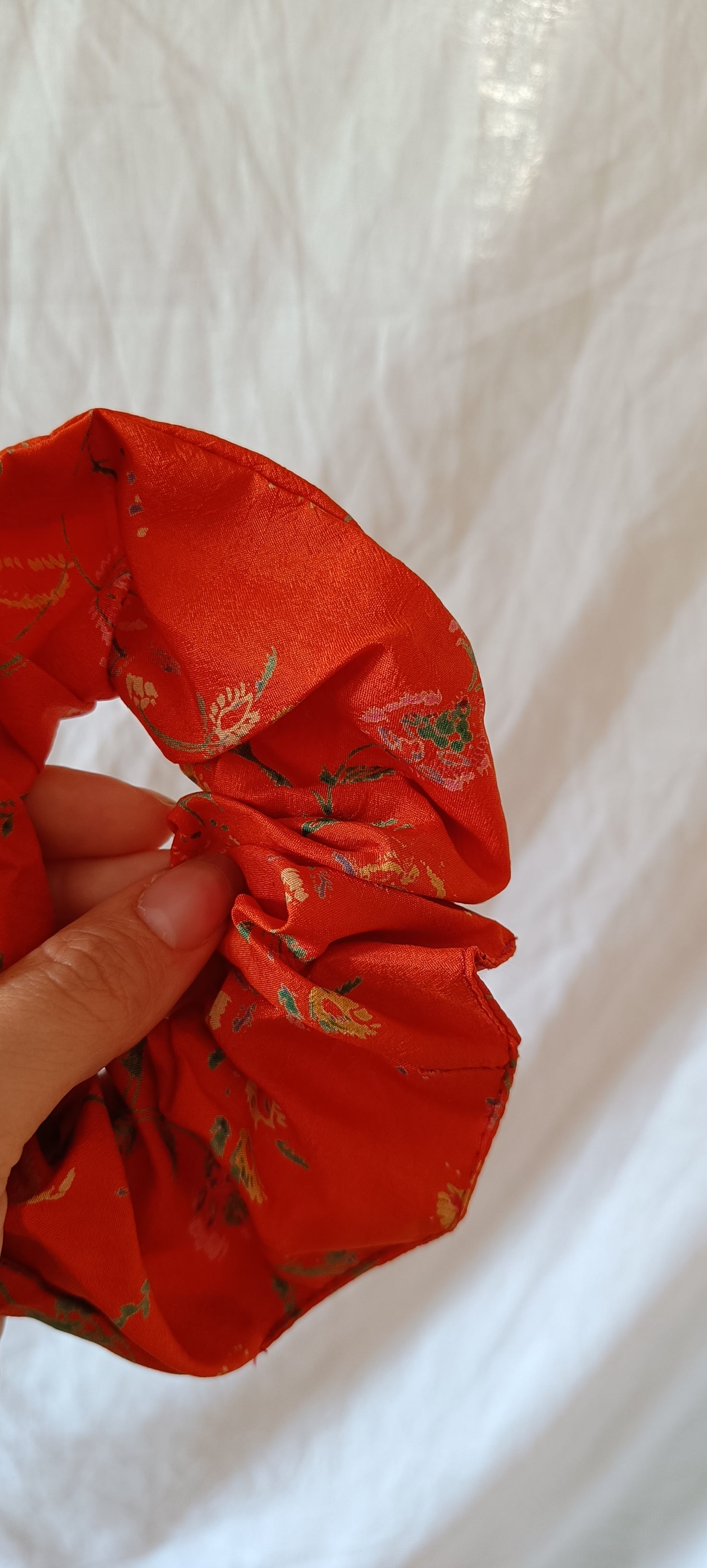 Helt unik scrunchie i vintage silke. Passar perfekt som hårsnodd eller som armband runt handleden när du inte använder den till håret. Pluspoäng för att silke sliter mindre på håret! Gjord av stuvbitar från handplockat vintagesilke från norra Indien.