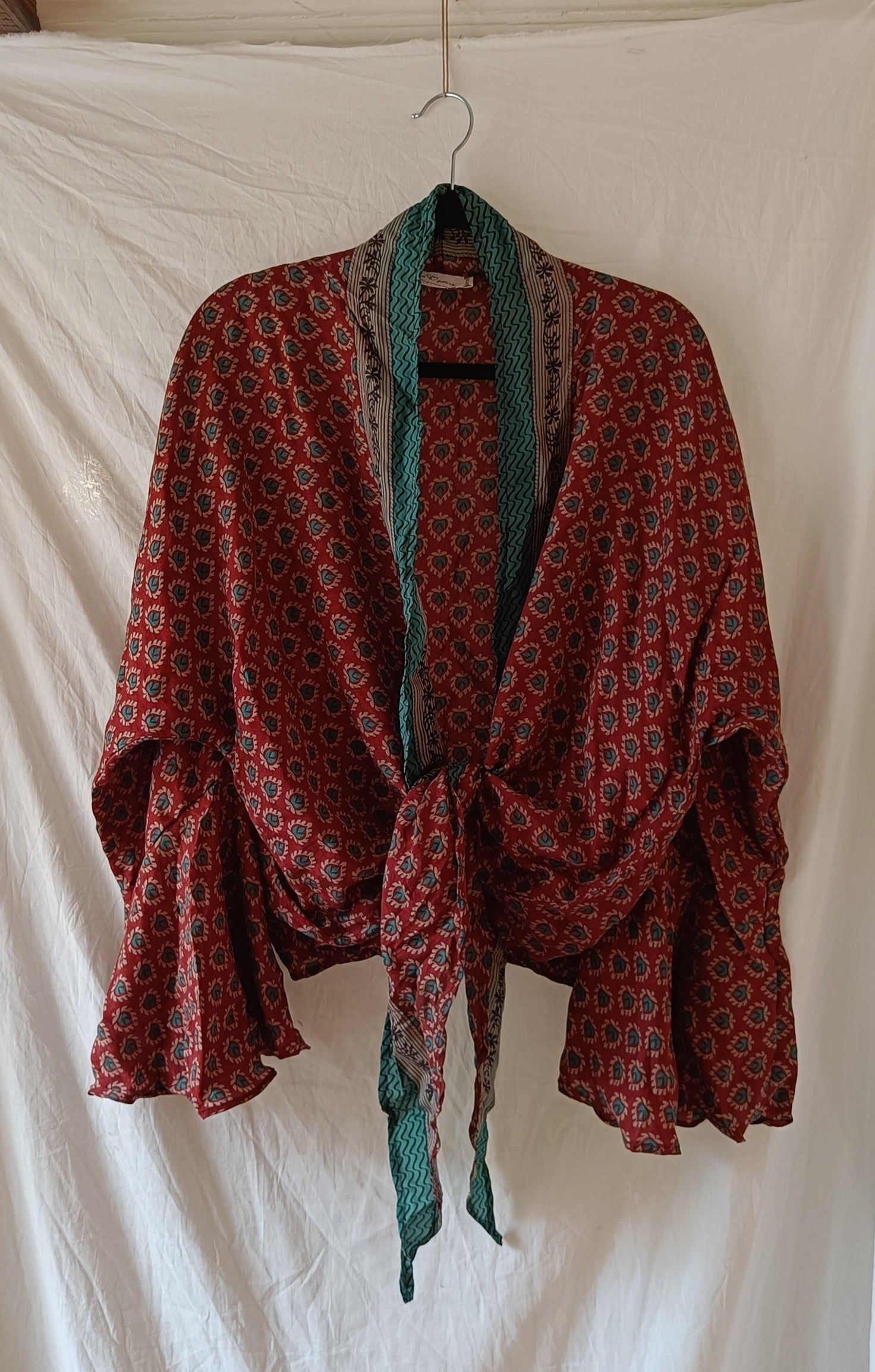 Då tyget är återbrukat silke kan det finnas mindre märken som är små tecken på den historia tyget bär på. På sista bilderna ser du hur modellen sitter på, första modellen bär normalt sett storlek S och andra modellen normalt sett storlek XL.