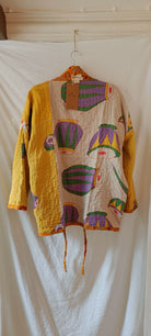 Helt unik kanthajacka i bomull. Gjord av handplockade kanthafiltar från norra Indien. Tyget räcker enbart till en jacka i just det här utförandet, vilket innebär att varenda en är helt one-of a kind. Jackan är vändbar (något jag älskade med 90-talets kläder och försöker få tillbaka!), har två stora fickor på ena framsidan samt snören som går att knyta framtill så jackan stängs.